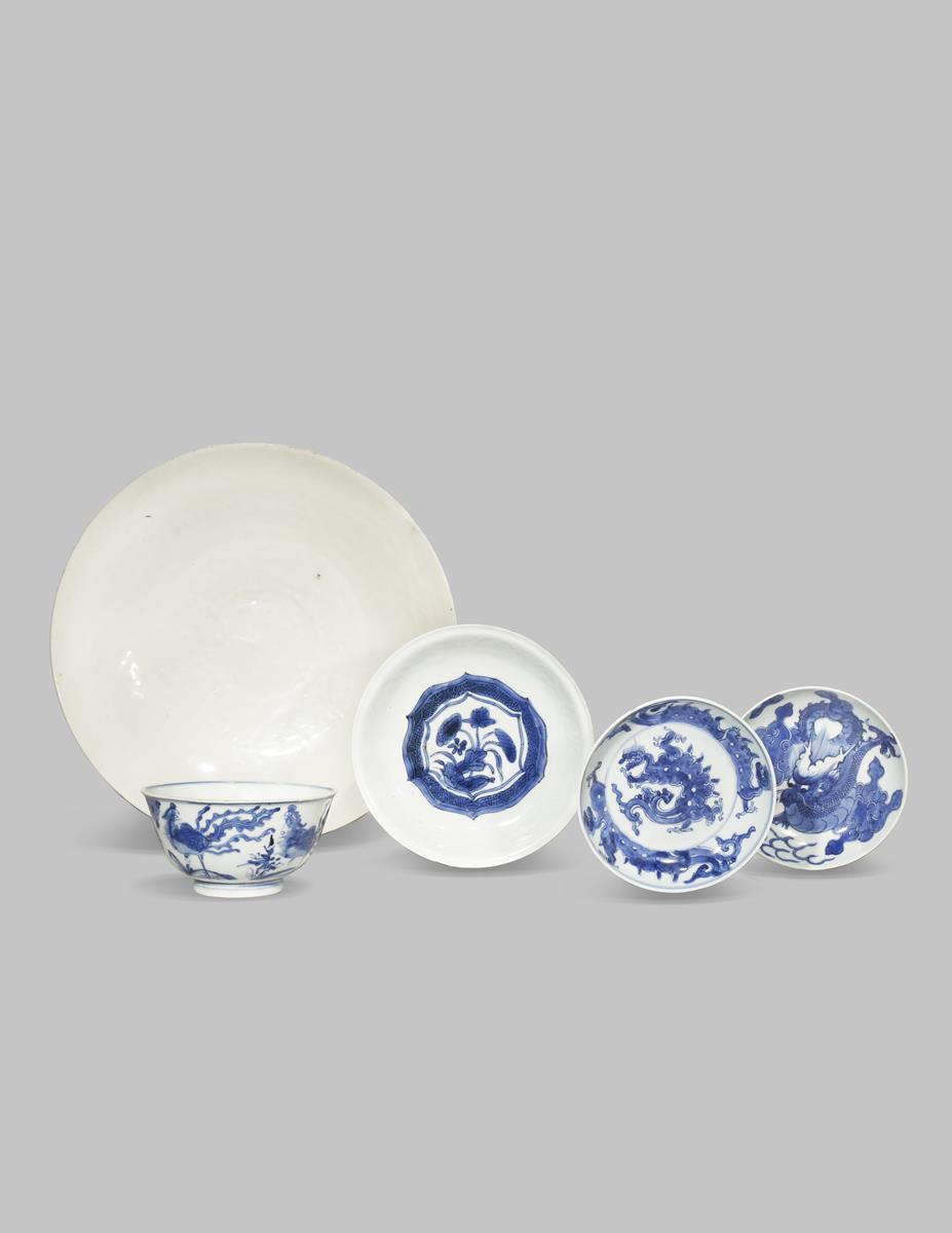 Comprising: a large white glazed Swatow dish, a plate painted with a spray of lotus within a moulded border, two dishes decorated with dragons and a deep bowl, painted with phoenix and lotus, 37cm. (5)