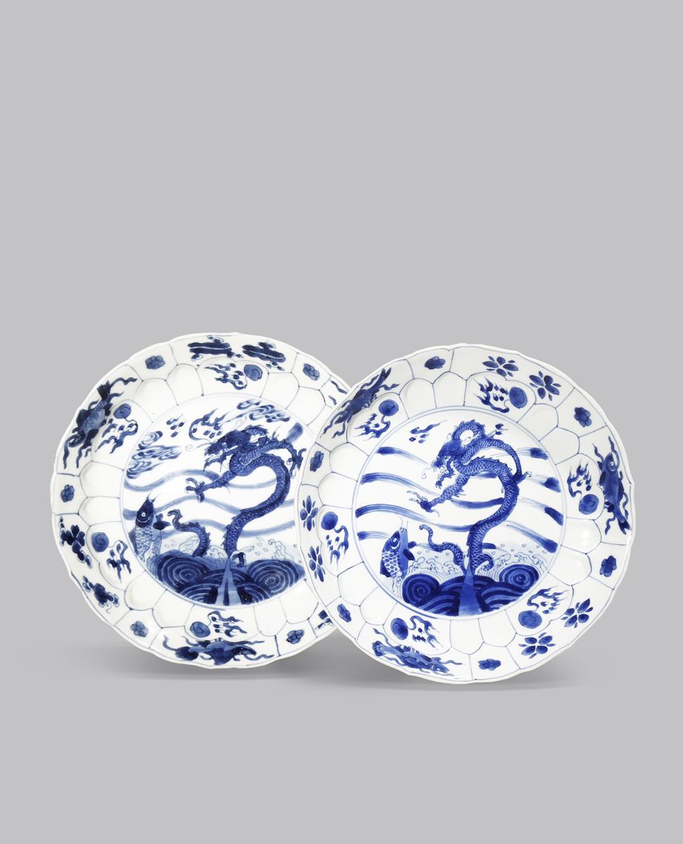 Each painted with a dragon and a carp emerging from swirling waves, the rims moulded as lotus petals and painted with flaming pearls of wisdom, stylised flowerheads and fish, basket-shaped marks and circular paper labels for Bluett & Sons, London, 20.7cm. (2)
