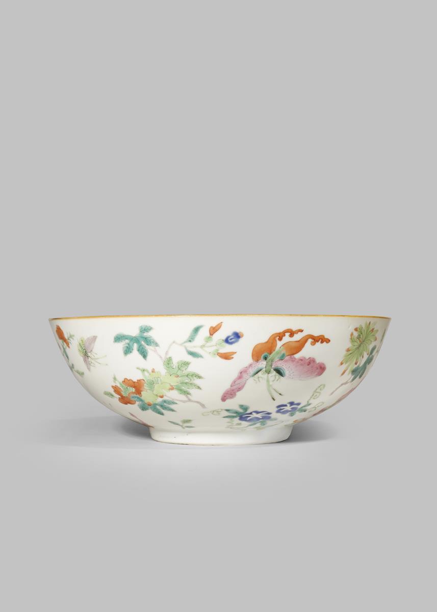 A CHINESE FAMILLE ROSE 'BUTTERFLY' BOWL 19TH CENTURY Painted with sprays of blossoms and butterflies, an endless knot mark to the base, 22.3cm.