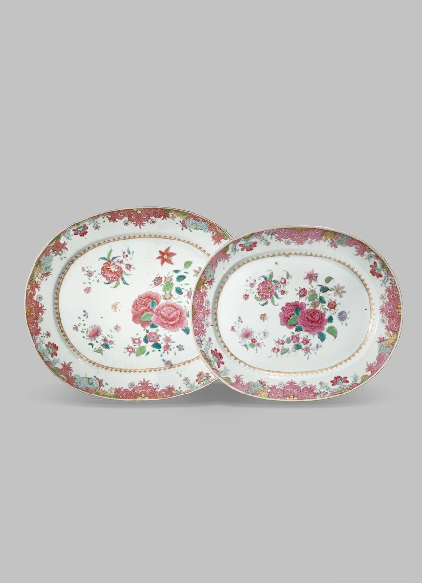 TWO CHINESE FAMILLE ROSE OVAL DISHES 18TH CENTURY Each painted in bright enamels and gilt with...