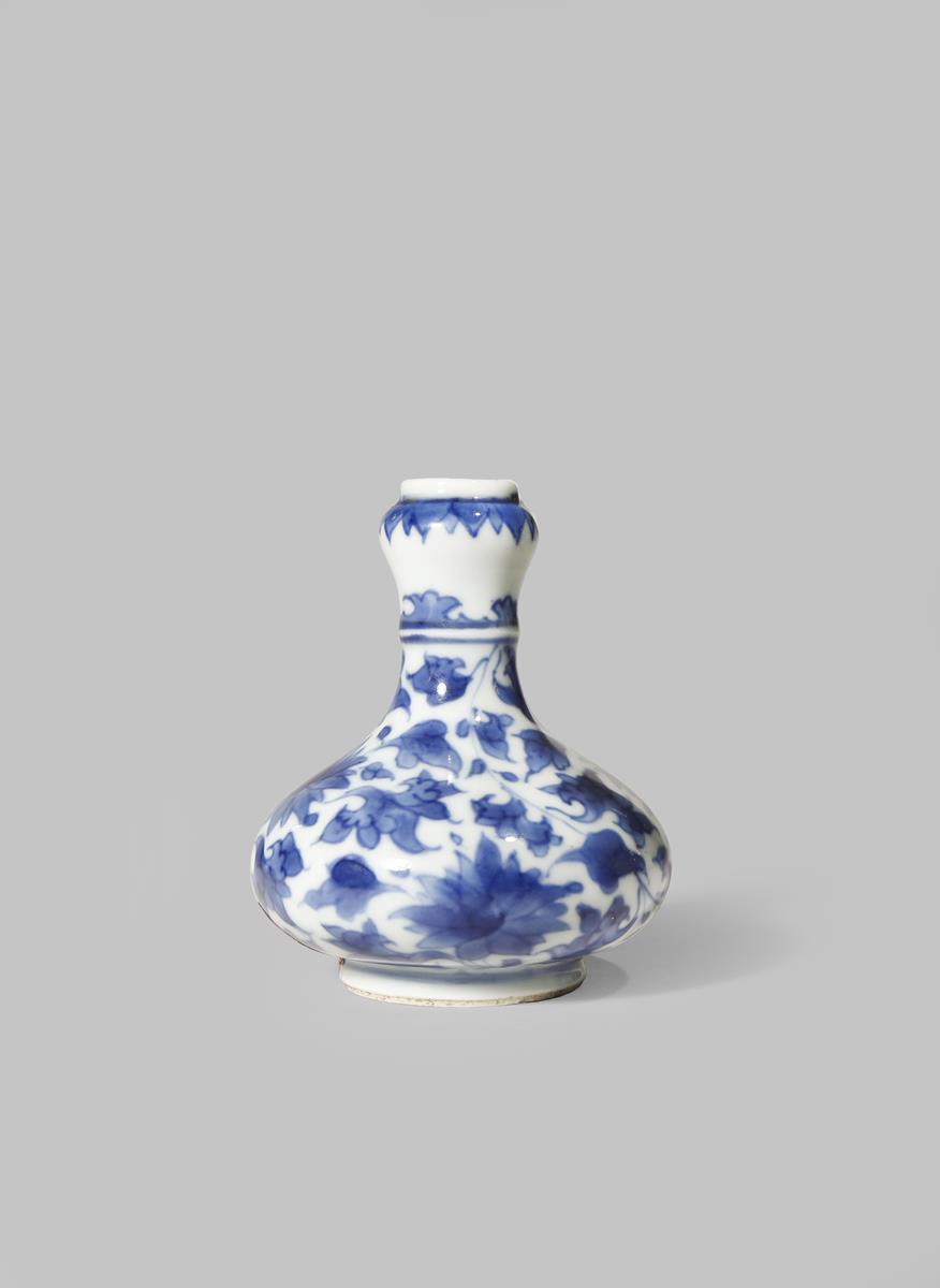A SMALL CHINESE BLUE AND WHITE BOTTLE VASE KANGXI 1622-1722 With a compressed circular body with...