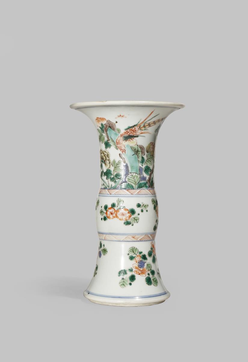 A CHINESE FAMILLE VERTE GU-SHAPED VASE KANGXI 1662-1722 Painted with floral sprays and a pheasant...