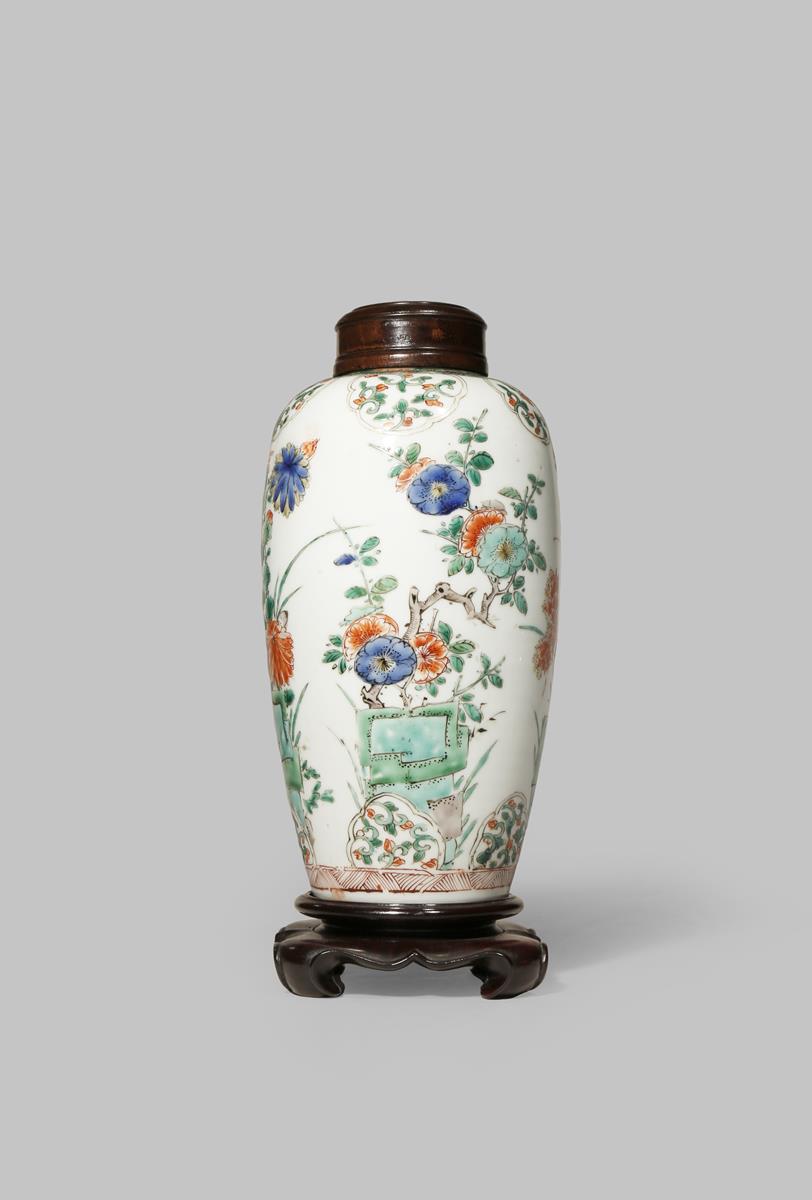 A CHINESE FAMILLE VERTE VASE KANGXI 1662-1722 With a slender ovoid body painted with four floral...