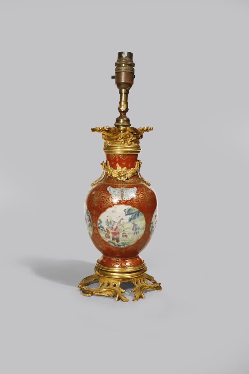 Decorated with four shaped cartouches with boys in a garden and large butterflies to the shoulder, with stylised lotus flowerheads and foliage in gilt, mounted in later ormolu as a lamp, 38cm.