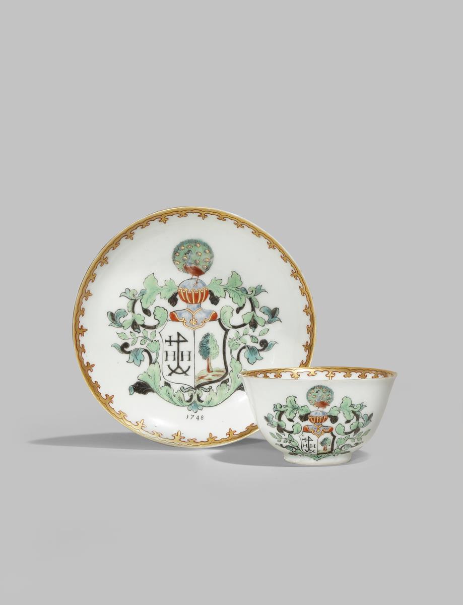 A CHINESE ARMORIAL TEA BOWL AND SAUCER DATED 1748 Decorated with the initials HH and a merchant's...