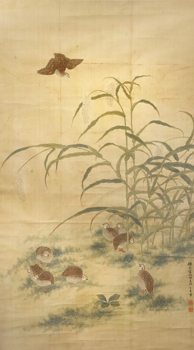 WANG JIAN ZHANG (17TH CENTURY) QUAILS AND MILLET IN THE SONG DYNASTY STYLE A rare Chinese scroll...