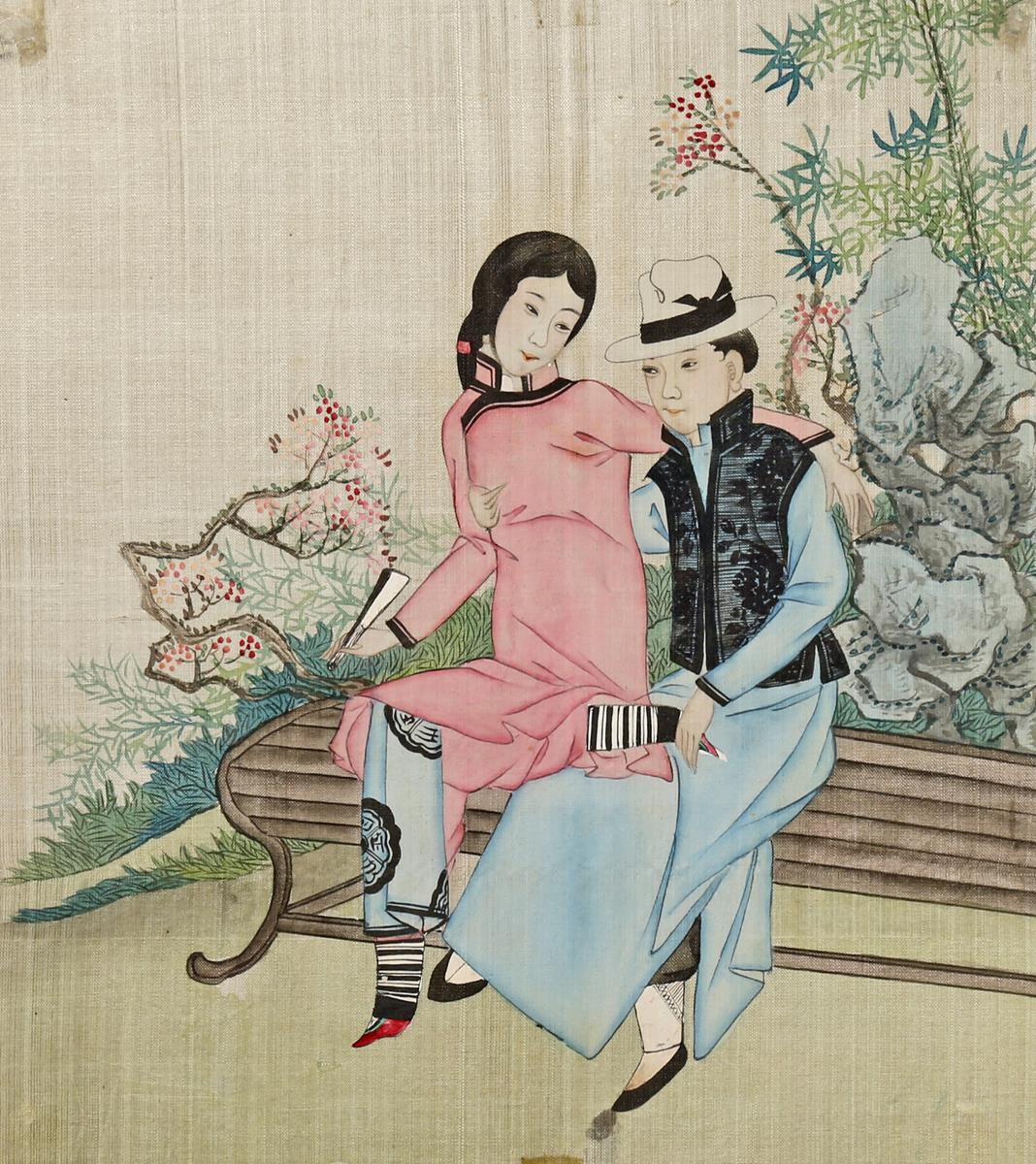 A Chinese album of twenty-two erotic paintings, ink and colour on silk, mounted, 25cm x 22cm.