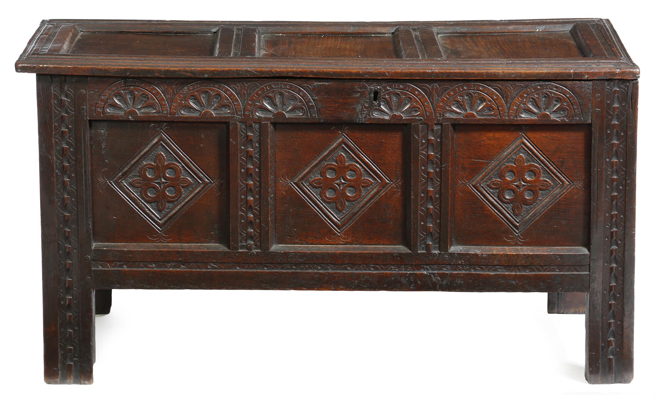 A Charles II oak triple panelled coffer, the hinged top revealing an open till, the front carved with a lunette frieze and with foliage lozenge panels, 63.5cm high, 116.8cm wide, 52.5cm deep.