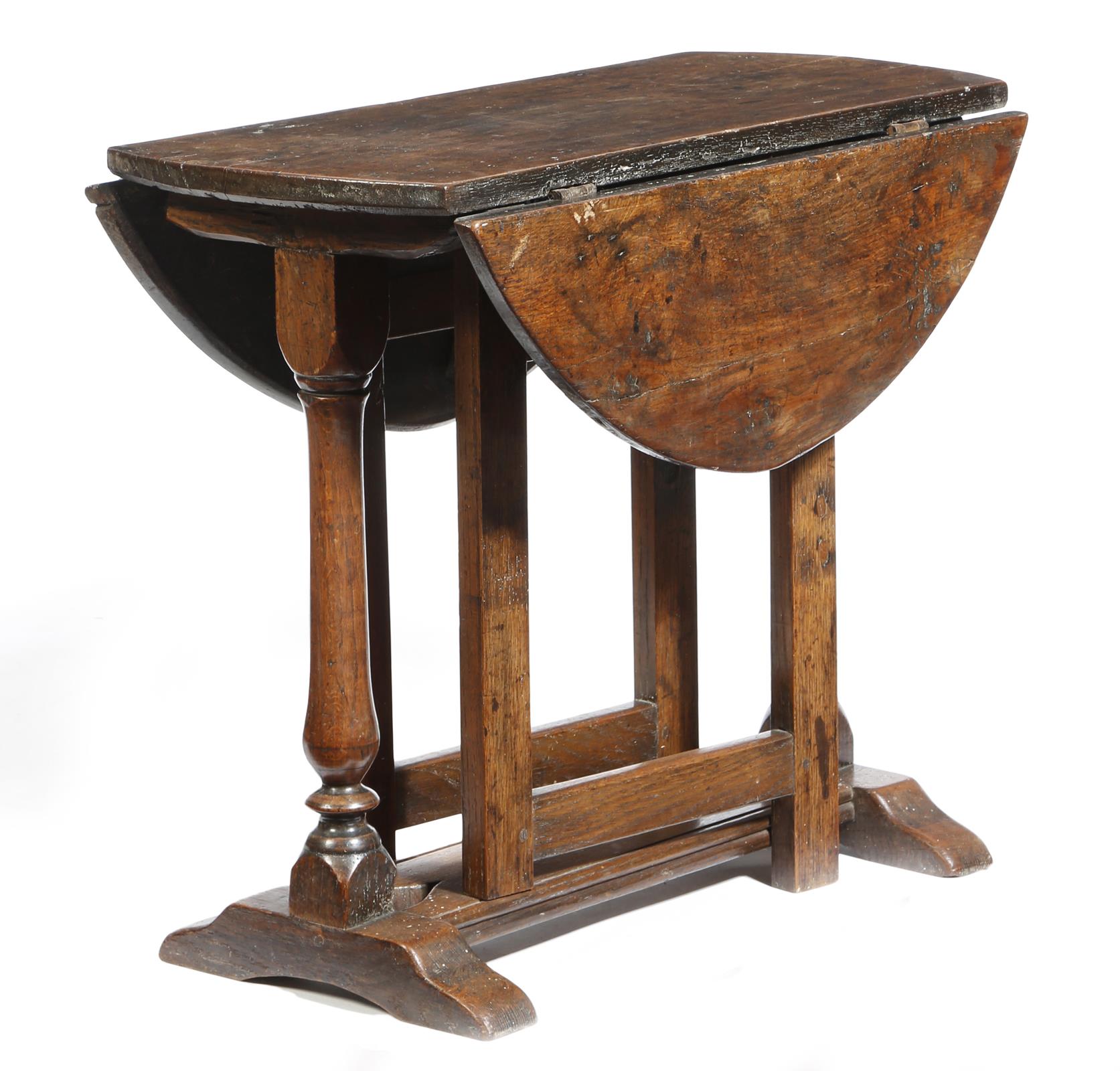 A small early 18th century oak gateleg table, the oval drop-leaf top on baluster and block end supports, with a pierced stretcher and sleigh type feet, 61.7cm high, 73.5 x 78.5cm (open).