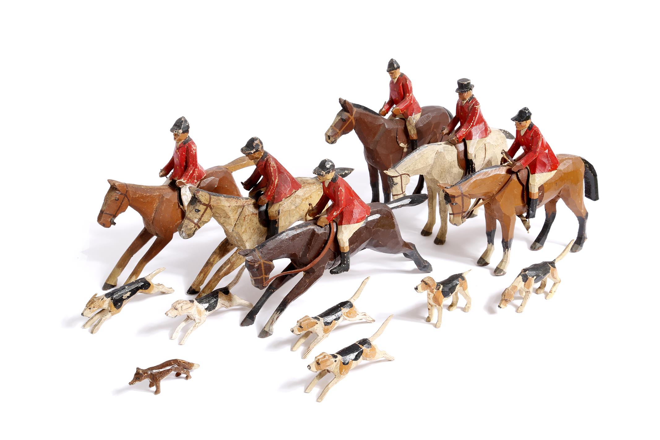 A carved and painted wood fox hunting group attributed to Frank Whittington, of Forest Toys, comprising: six horse and riders, six hound dogs and a fox, early 20th century, 21.5cm (max). (13)