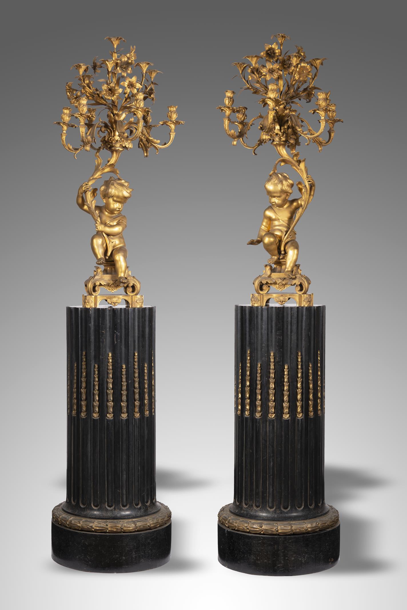 A pair of large and impressive Napoleon III ormolu figural twelve-light candelabra attributed to Raingo Freres, each modelled with a seated putto holding a leafy branch issuing six leaf-scroll arms and further lily flowers and leaves, the underside of the base inscribed in pen 'Raingo 11 Vieux', some of the leaf scroll feet stamped 'RG', each on an ebonised stop fluted column plinth with ormolu mounts, the base with a laurel wreath, the candelabra 112.1cm high, the column 100cm high, 51cm diameter. (4)
