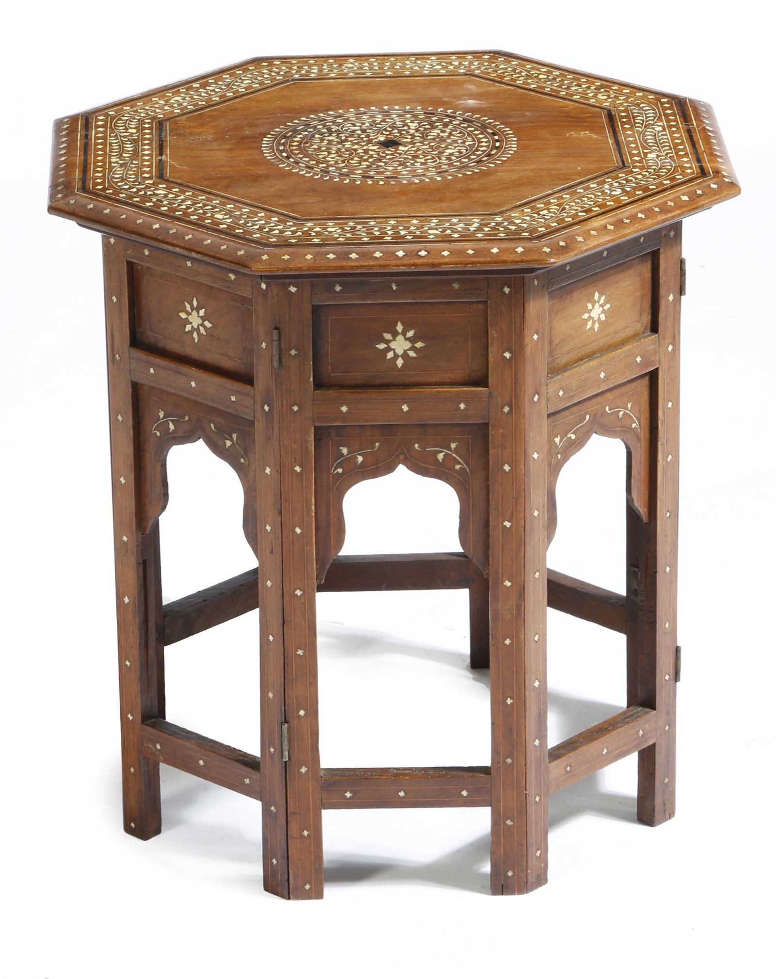 λ An Anglo-Indian hardwood octagonal occasional table, inlaid with ebonised stringing and bone and ivory scrolling leaves and foliage, the detachable top on a folding base, Hoshiarpur, late 19th / early 20th century, 47cm high, 49cm wide.