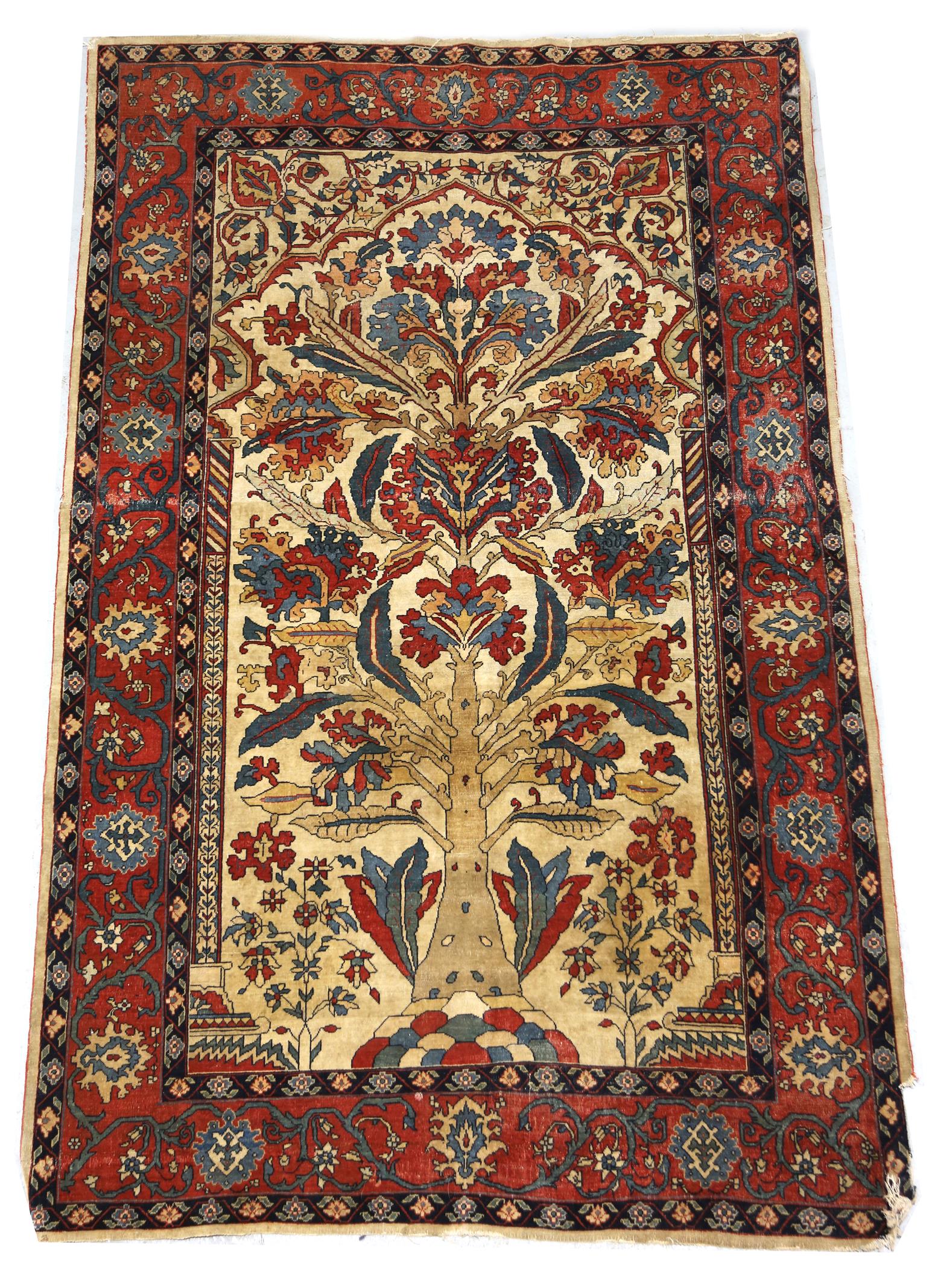 A north west Persian rug, decorated with a tree of life flanked by columns, on an ivory ground, 212.5 x 133cm.