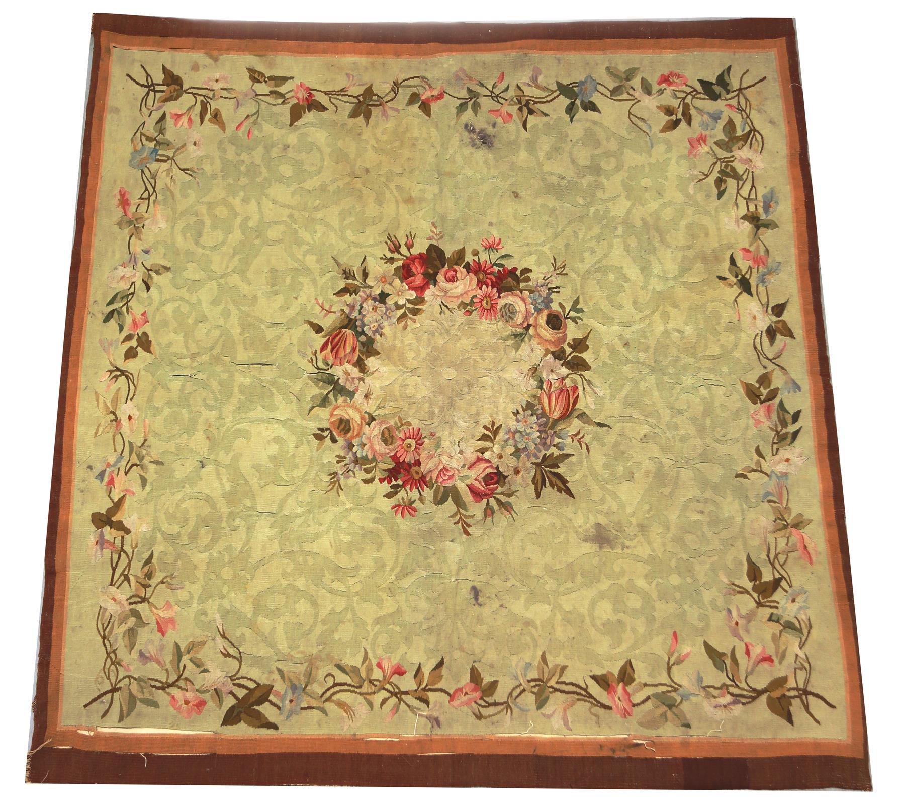 A 19th century French Aubusson tapestry rug, decorated with a floral wreath and borders, on a scrolling foliage ground, 171 x 160.5cm.