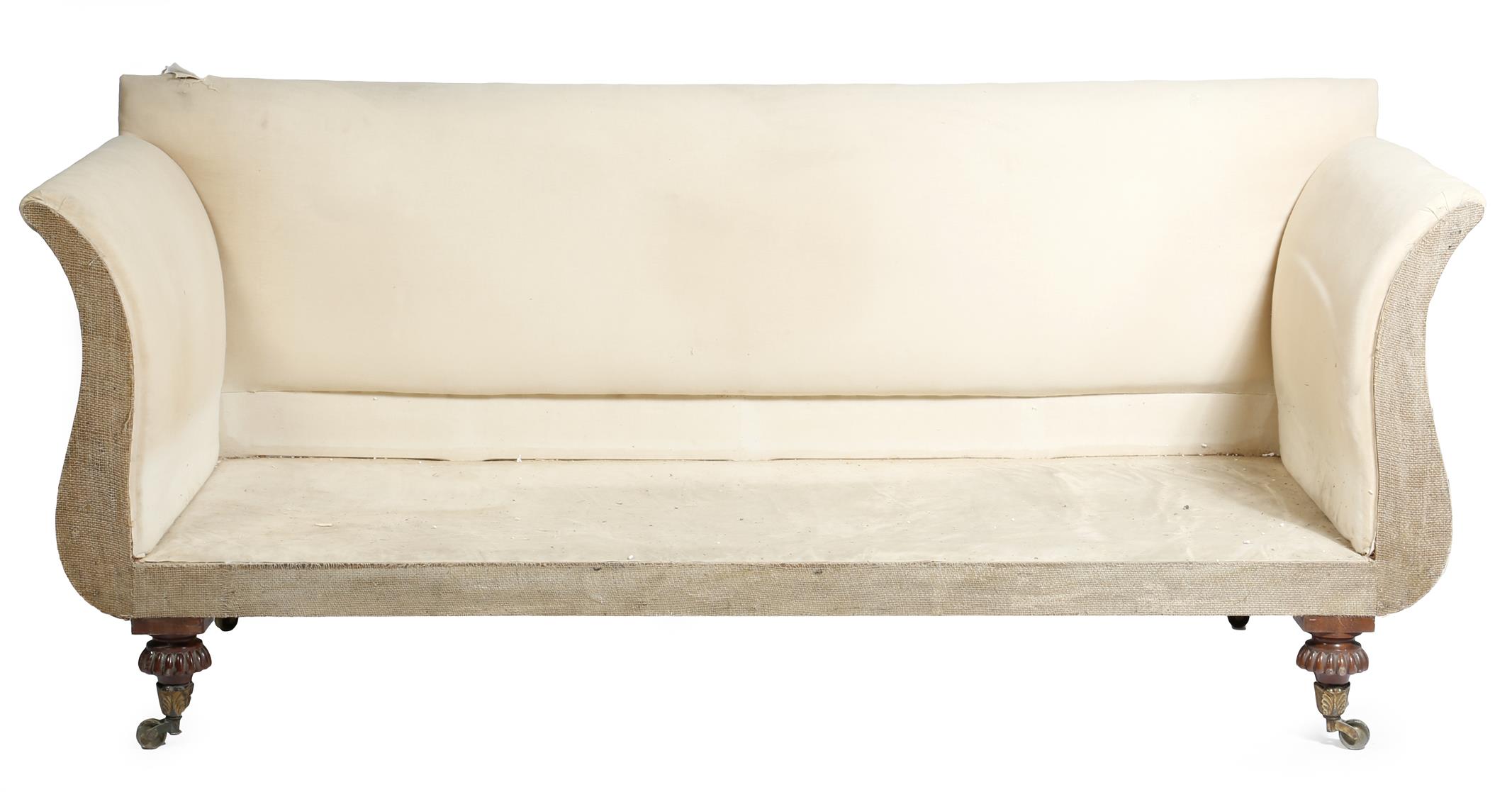 A scroll end sofa of country house proportions, on mahogany ribbed mushroom feet and leaf cast brass caps and castors, 93.5cm high, 216cm wide, 80.5cm deep.