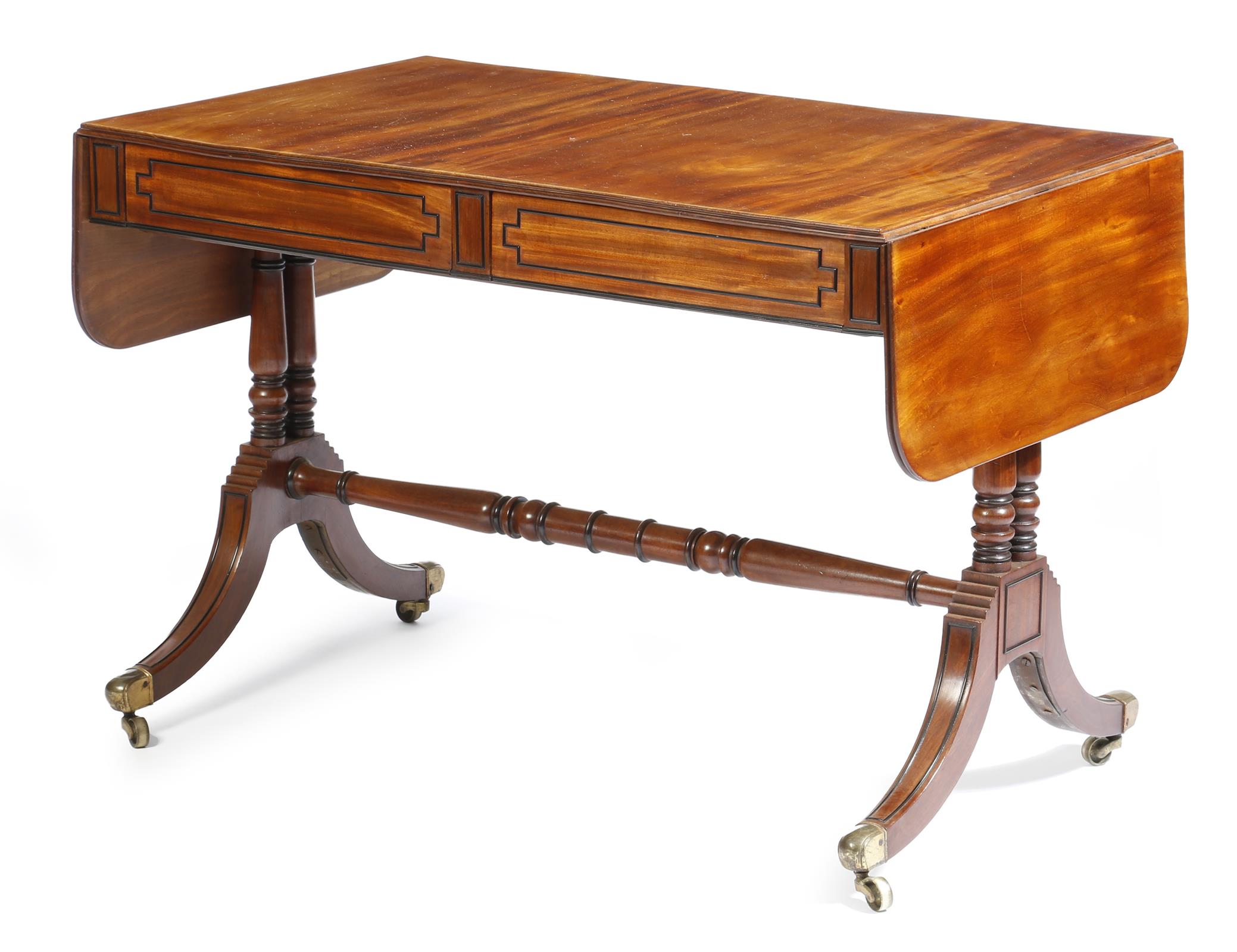 A late Regency mahogany sofa table, with ebonised outline mouldings, the drop-leaf top with a reeded edge, above a pair of cedar lined frieze drawers, on twin baluster end supports, a stepped base and splay legs, united by a turned stretcher, on brass caps and castors, 73.2cm high, 66 x 157cm (open).