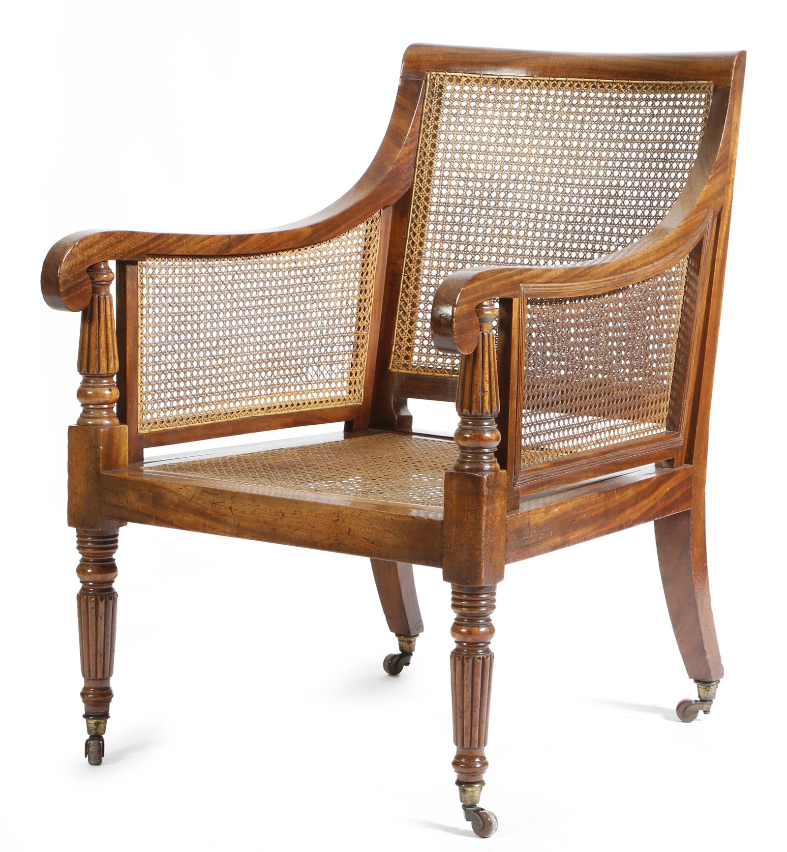 A George IV mahogany bergère armchair in the manner of Gillows, with a cane back, sides and seat, with ribbed arm supports and front legs, on later ceramic castors.