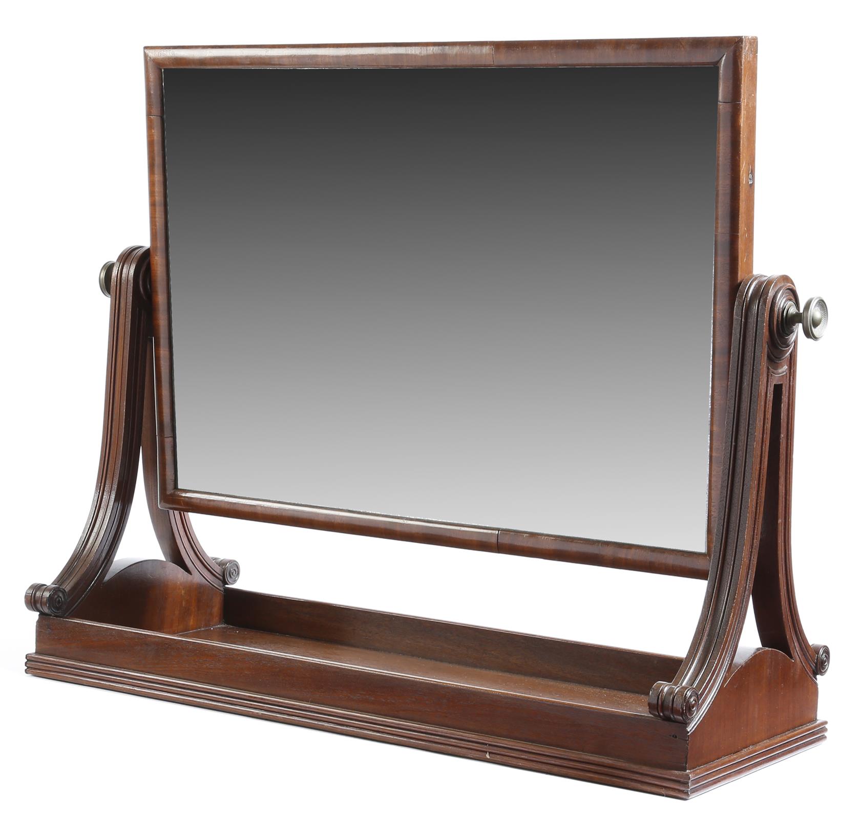 A George IV mahogany toilet mirror in the manner of Gillows, with a rectangular plate and fluted scroll supports and a rectangular tray base with a reeded edge, 53cm high, 66cm wide, 25.7cm deep.