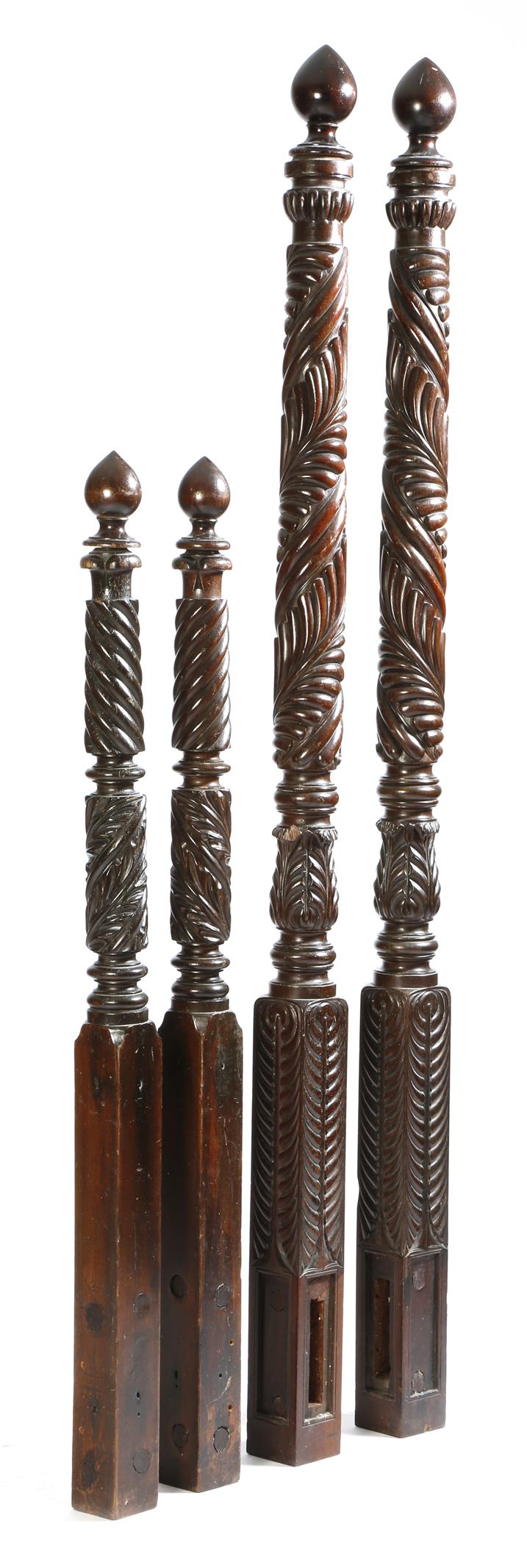 A pair of William IV mahogany bedposts in the manner of Gillows, the stem carved with palm fronds above acanthus leaves, the rectangular base with stylised leaf designs, with later finials, together with a similar smaller pair, 201.5cm high (max). (4)