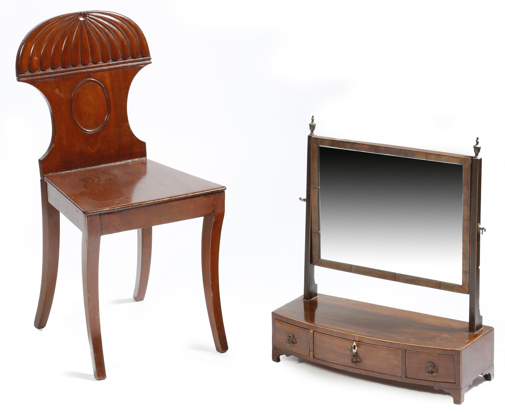 A Regency mahogany hall chair, on sabre legs, together with an early 19th century toilet mirror. (2)