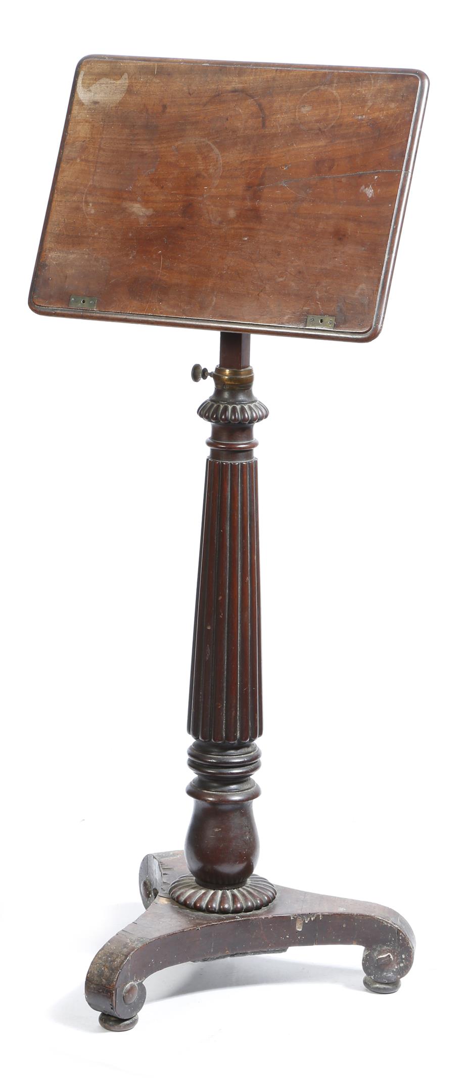 A William IV mahogany adjustable reading table in the manner of Gillows, the hinged top originally with a rest, on a lobed and ribbed tapering stem and triform base, 116.1cm high, 44cm wide.