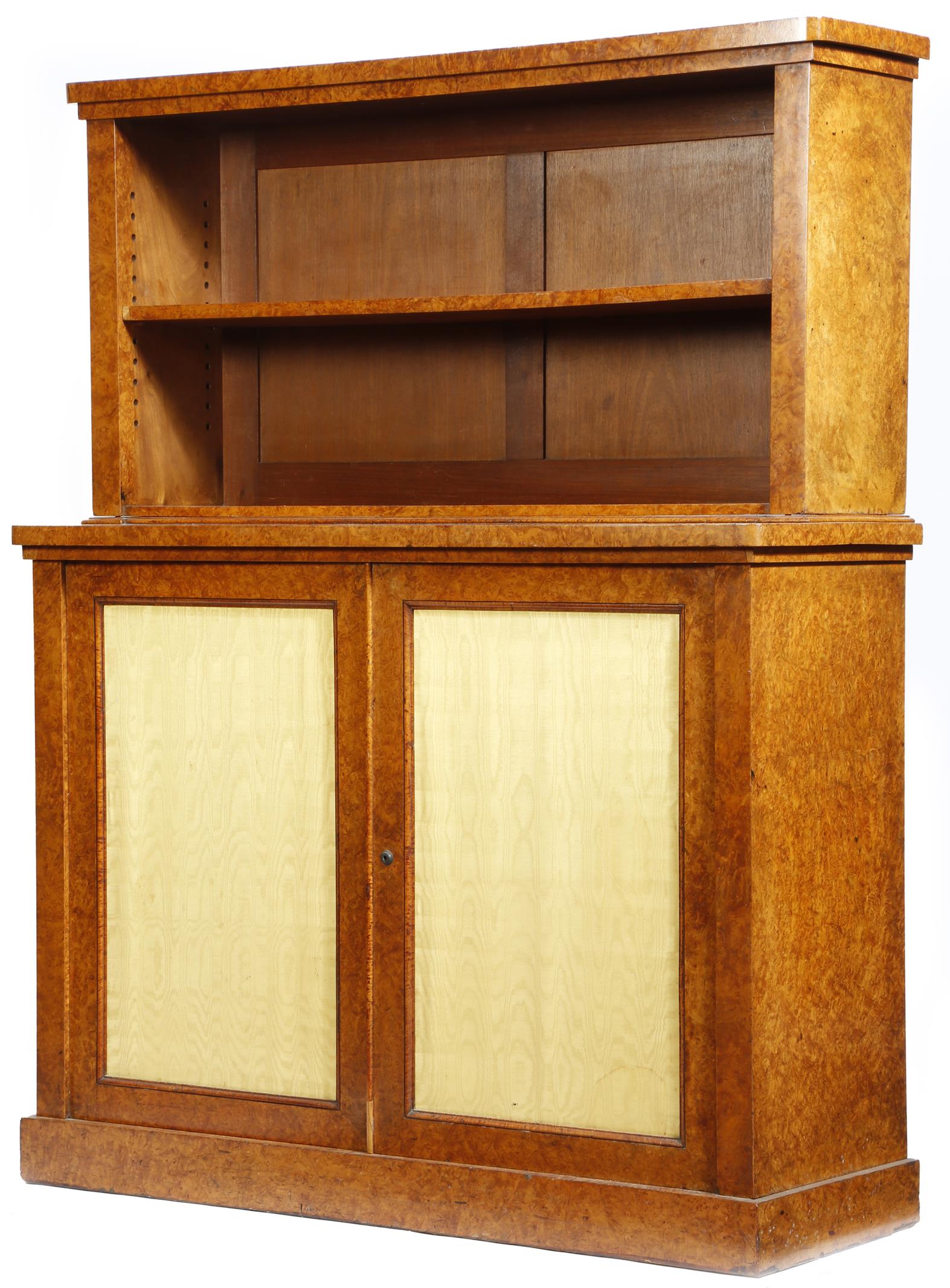A George IV amboyna bookcase cabinet in the manner of Gillows, the open top with two adjustable shelves, above a pair of doors with watered silk panels, enclosing two adjustable shelves, fitted with a Brahma lock, 152.4cm high, 122cm wide, 40.4cm deep.