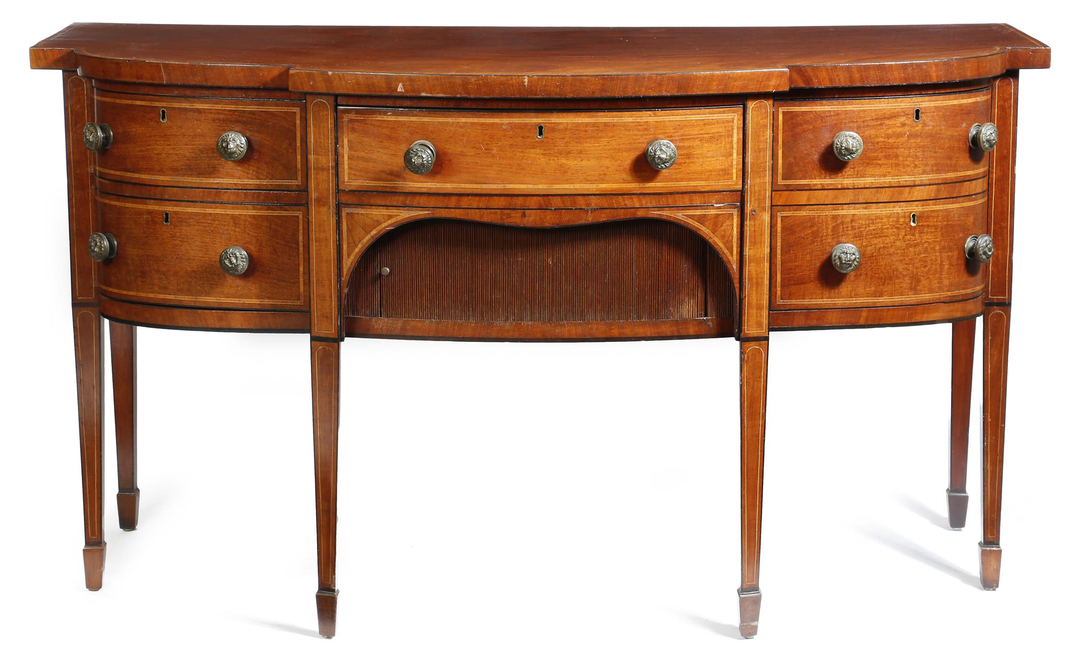 A Regency mahogany breakfront sideboard, inlaid with kingwood banding and ebonised and boxwood stringing, fitted with three drawers, a deep cellaret drawer and a tambour shutter, 95.8cm high, 168.7cm wide, 70.5cm deep.