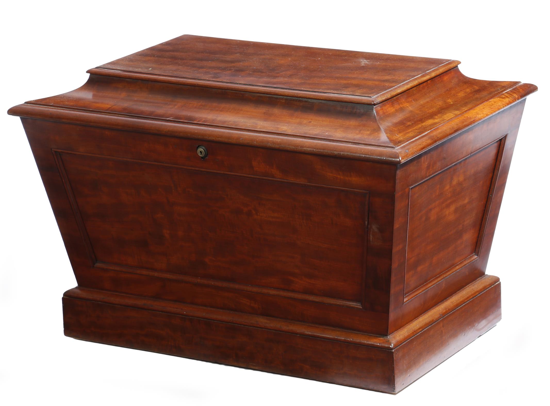 A George IV mahogany wine cooler, of sarcophagus shape, the interior with a later lining and with a brass Brahma lock, on castors, 52cm high, 77cm wide, 50cm deep.