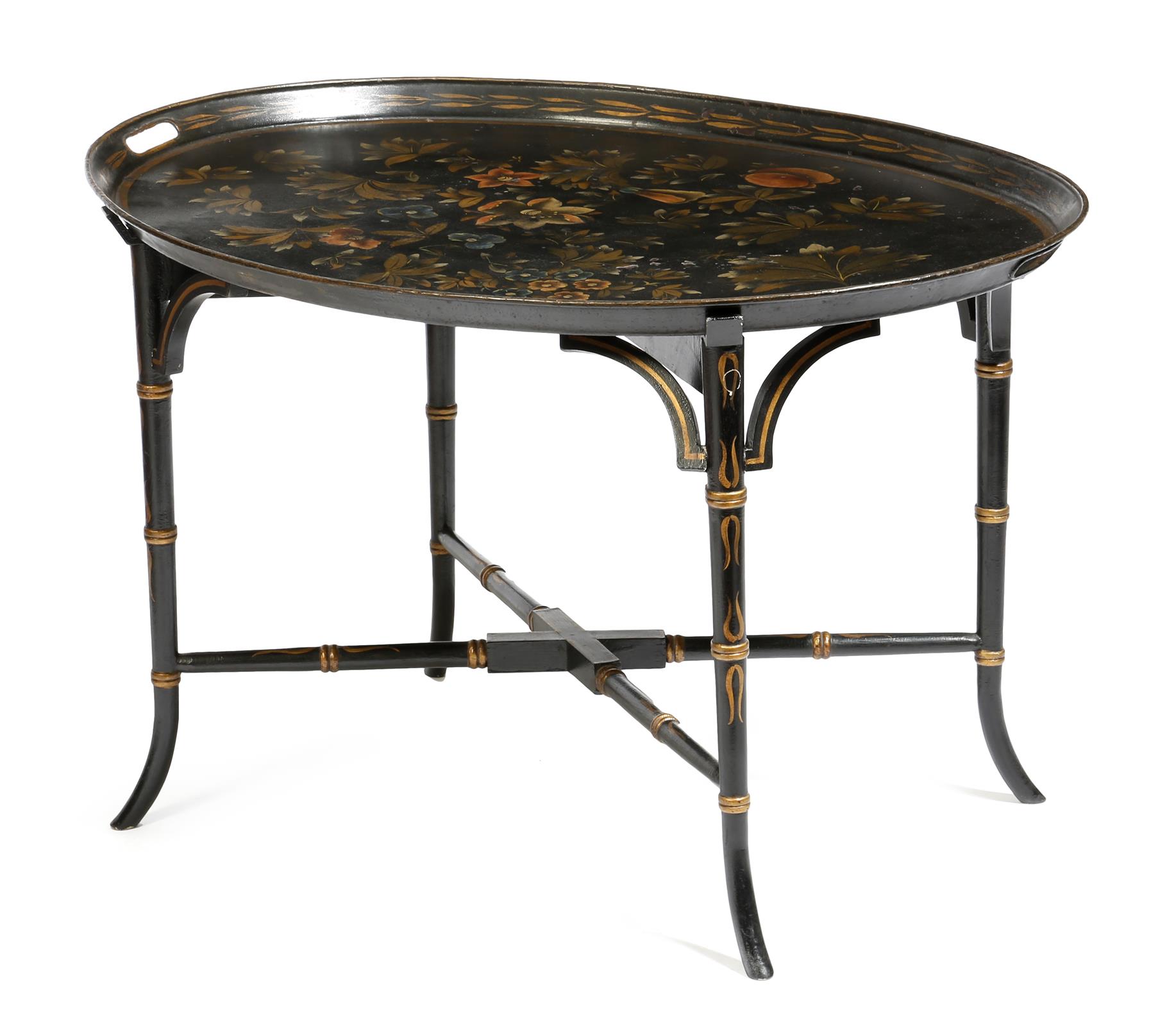 An early 19th century tôle oval tray, decorated with flowers, fruit and leaves, on a later ebonised and gilt stand, 48cm high, 75.6cm wide, 57cm deep.