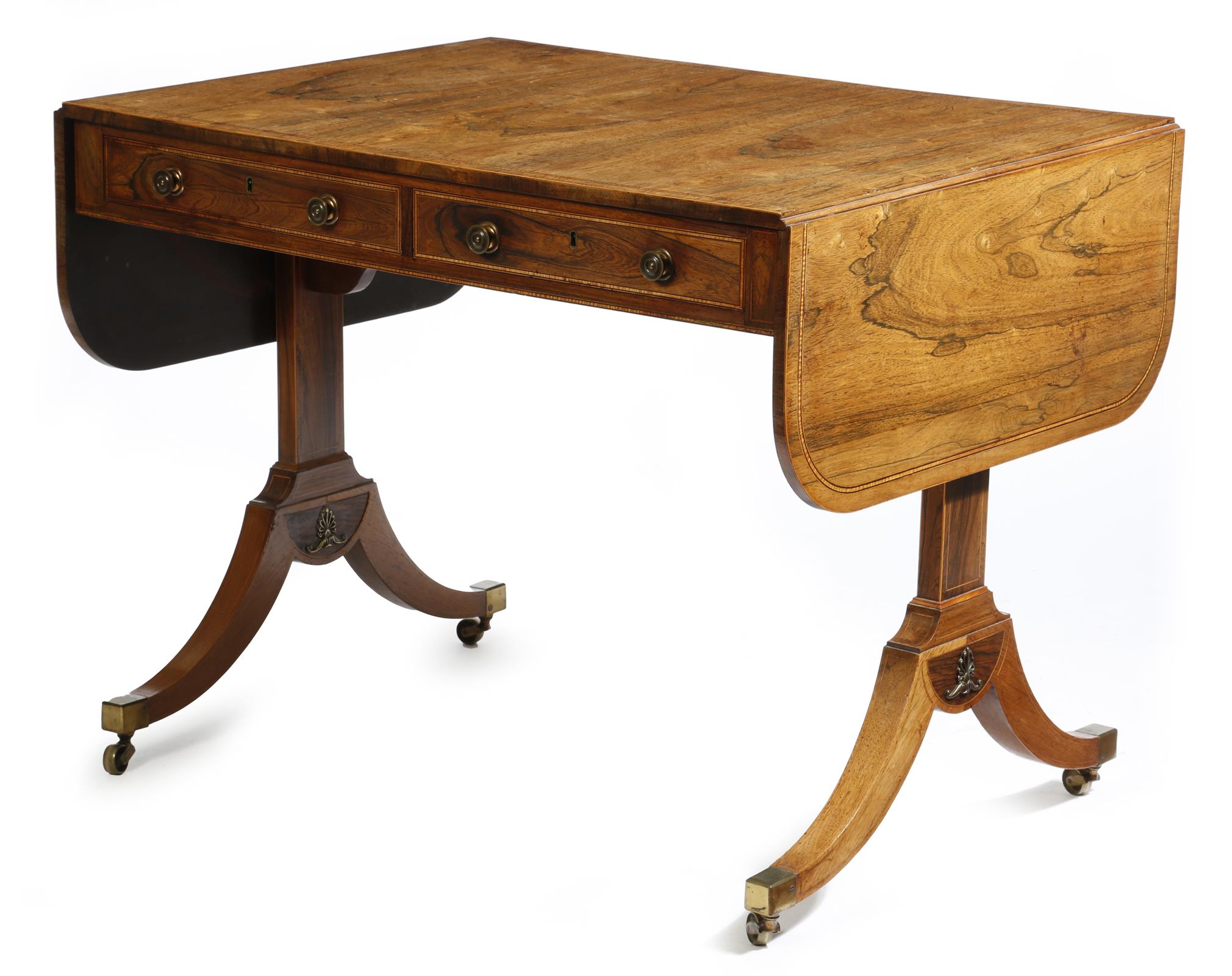 λ A Regency rosewood sofa table, inlaid with ebonised and satinwood banding, and with gilt brass anthemion mounts, the drop-leaf top above a pair of frieze drawers, with a high stretcher, on splay legs and brass caps and castors, 71.5cm high, 68.2 x 146.2cm (open).