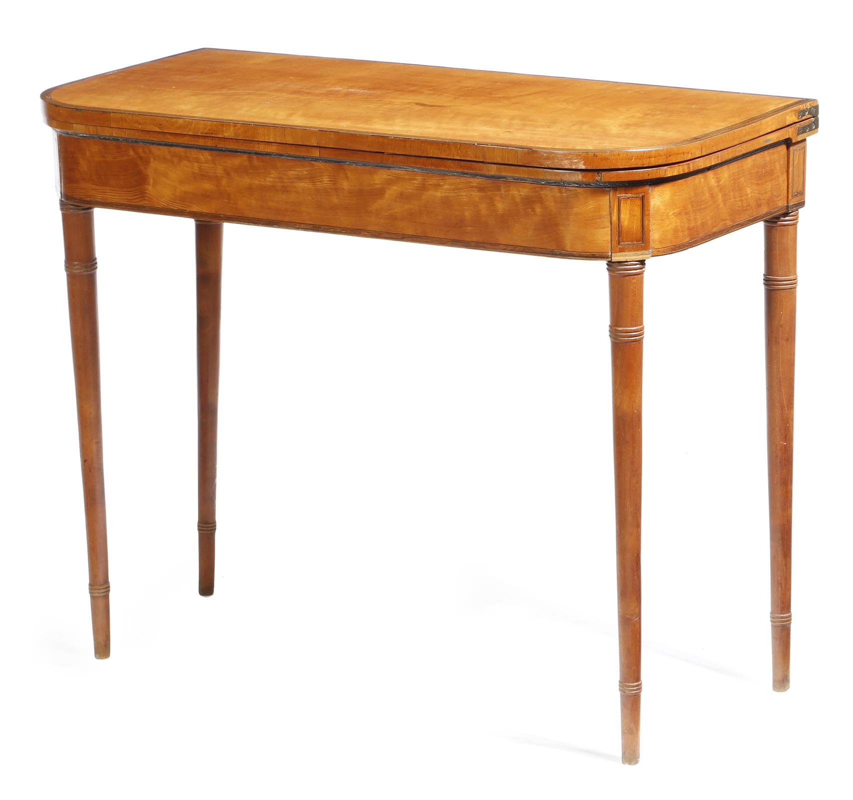 A Regency satinwood card table, the 'D' shape fold-over top with partridgewood banding, on twin gate supports, 73.3cm high, 90.8cm wide, 43.8cm deep.
