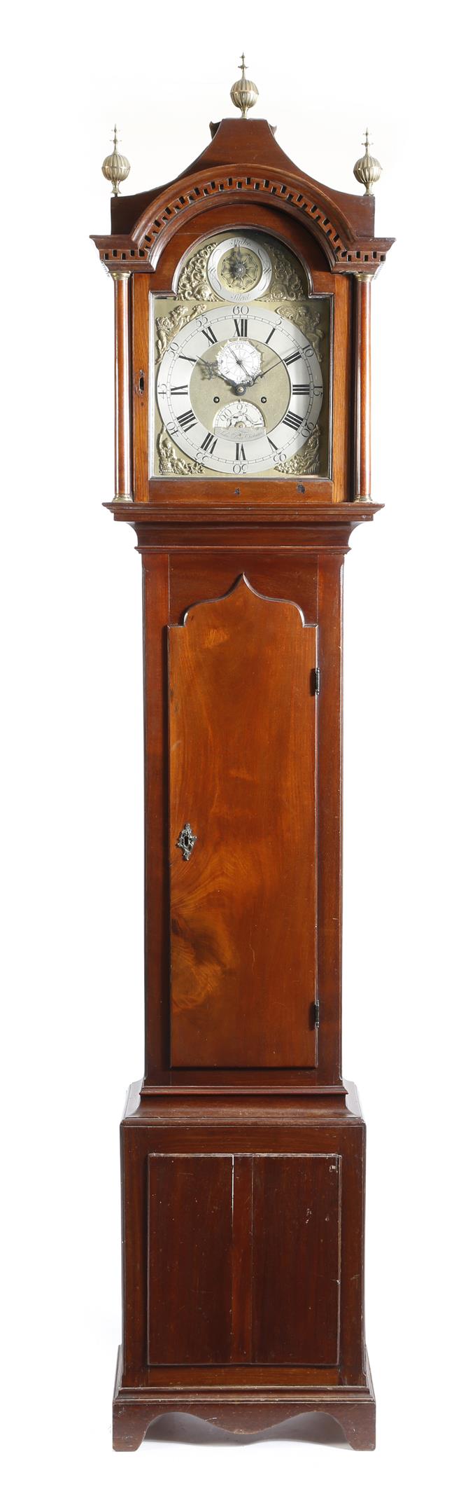 A late George III mahogany longcase clock by John Price of Chichester, the eight day movement with an anchor escapement and five turned pillars striking on a bell, the twelve inch brass arched dial with Roman and Arabic numerals to the silvered dial, with subsidiary seconds and date dials, inscribed 'John Price Chichester', with four season spandrels and Strike/Silent dial to the arch, with a pagoda top hood and a Gothic ogee trunk door, 227.5cm high.