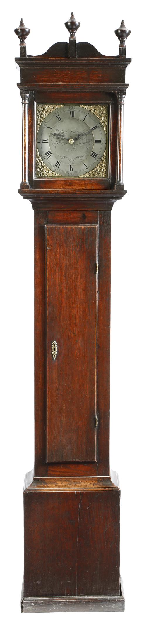 A George II oak longcase clock by Paul Thackwell of Ross, the thirty-hour brass birdcage movement with an anchor escapement and striking on a bell, the ten inch dial with a silvered chapter ring, with Roman and Arabic numerals, the centre engraved with scrolls and a Chinese style pagoda and signed 'Paul Thackwell ROSS' with Rococo cast gilt brass spandrels, the hood with three turned finials and plain columns, above a trunk door with a moulded edge, 210.5cm high.