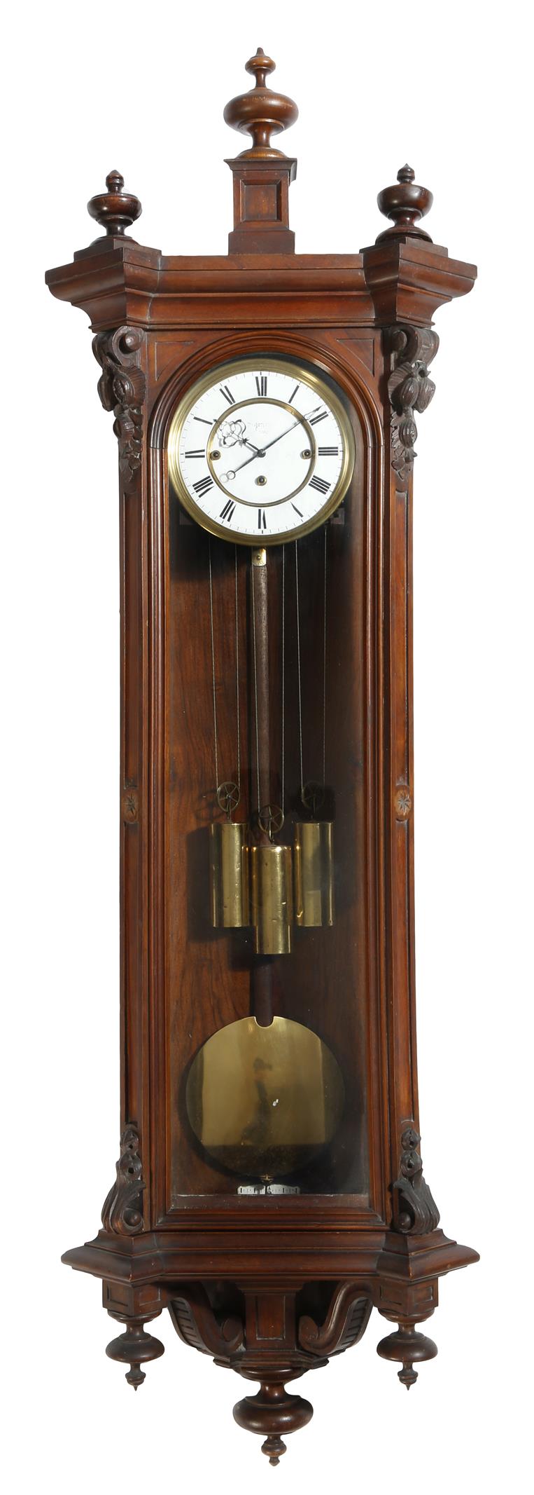 A 19th century Austrian walnut Vienna regulator, the eight day three train grande sonnerie brass movement striking on two bells, with an anchor escapement, the enamel dial with Roman numerals, blued steel hands and indistinctly signed to the recessed centre, in a typical case, with turned finials and carved applied corbels, 140cm high.