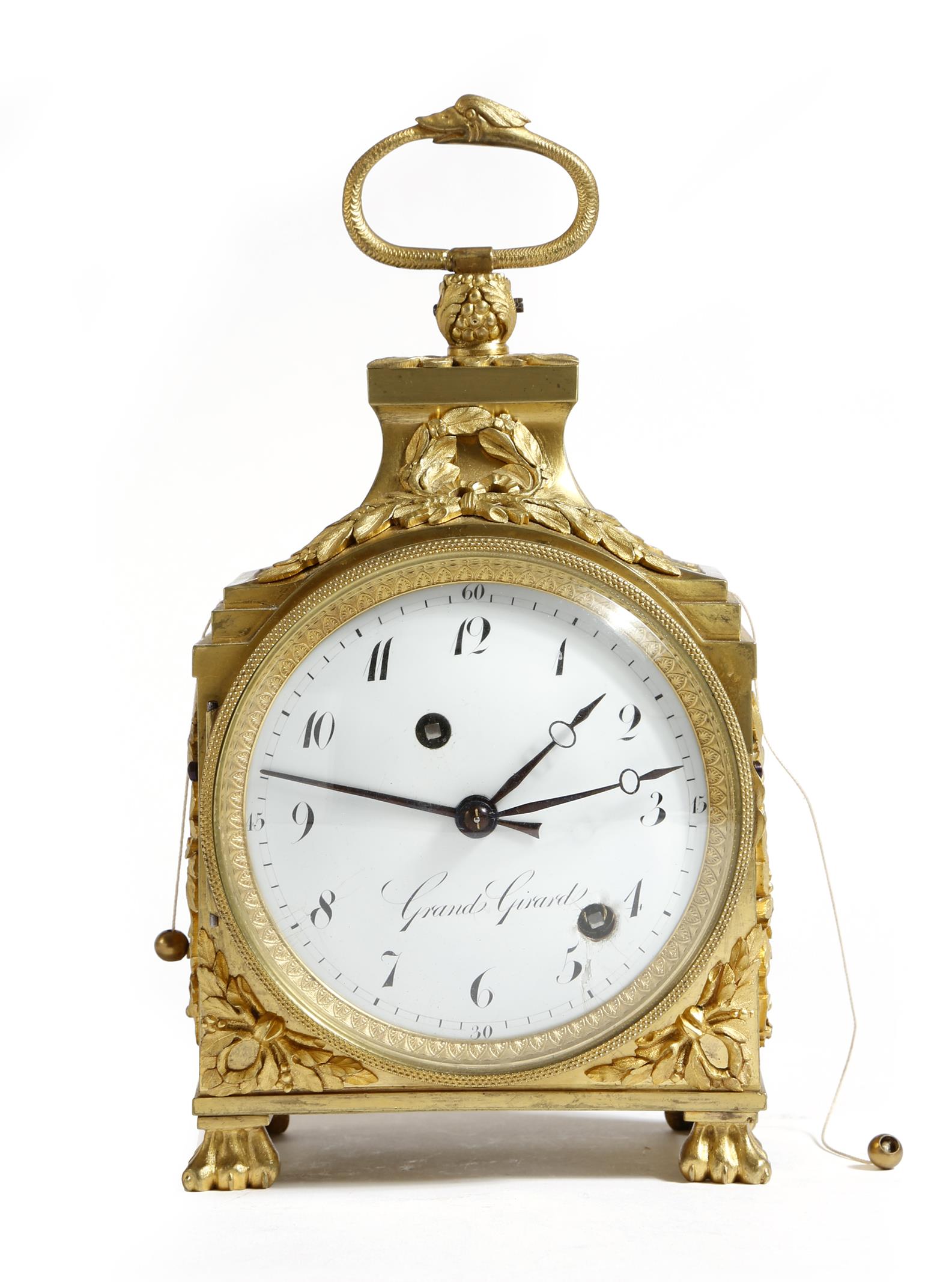 A Swiss ormolu grande sonnerie pendule d'officier by Grand Girard, the twin train movement with verge escapement and striking on two bells, with mono-metallic balance wheel and alarm, the three and a quarter inch enamelled dial with Arabic numerals and inscribed 'Grand Girard', the case with a serpent carrying handle and decorated with wreaths, flowers, leaves and patterae, with pull-repeat and pull-wound alarm, on paw feet, late 18th / early 19th century, 20cm high.