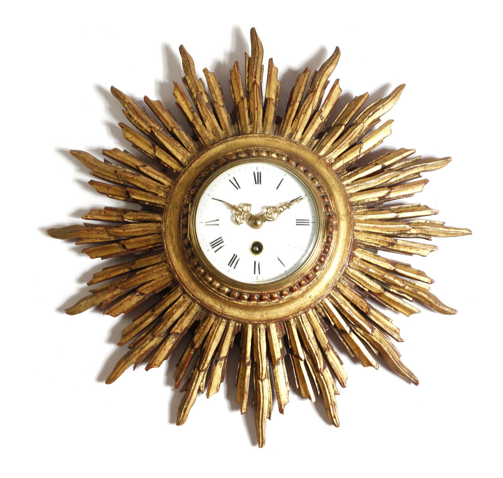 A giltwood sunburst wall timepiece, the brass movement by Japy Frères & Cie, stamped and numbered '38395', the white enamel dial with Roman numerals, the rear of the case inscribed 'COPYRIGHT DESIGN Rd. 741811', 38cm wide.
