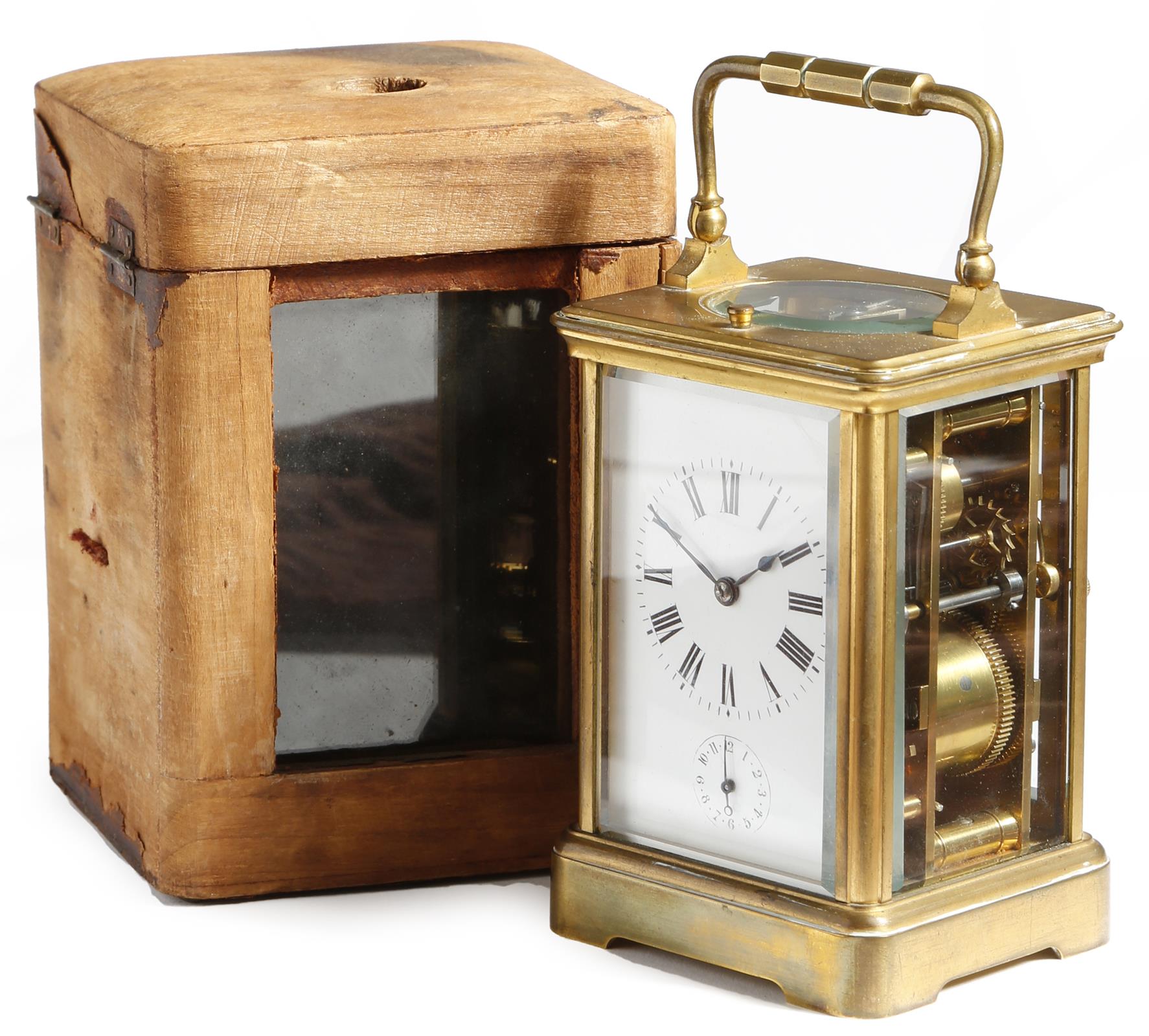 A late 19th century French brass repeating carriage clock, the twin barrel movement with a platform lever escapement, striking on a gong, the backplate stamped 'PATENT SJRETY POLLER', the white enamel dial with Roman numerals and subsidiary alarm dial, in a brass corniche case, with travelling case. (2)