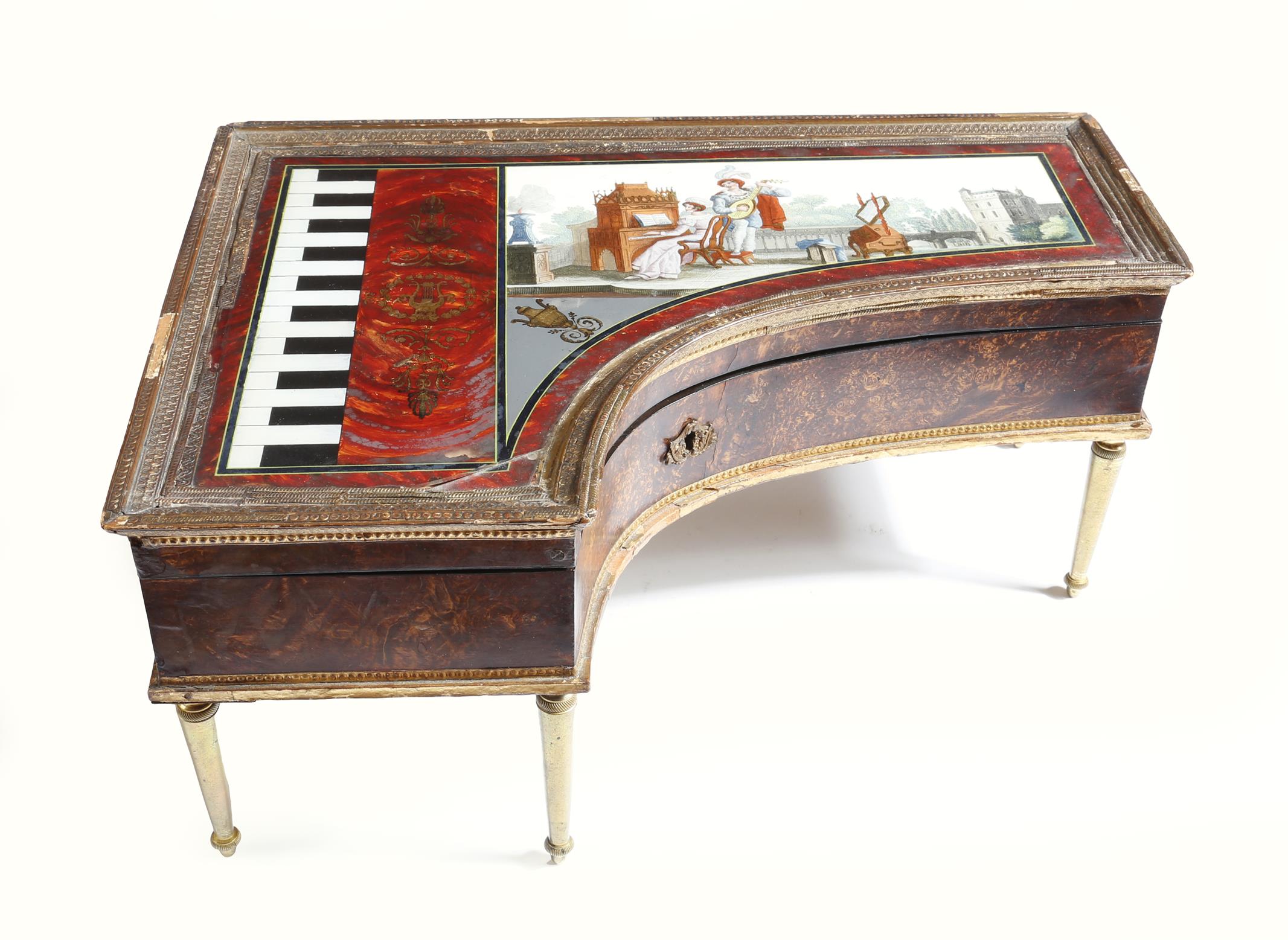 An early 19th century French verre églomisé and stained maple piano etui, with moulded gilt decoration, the hinged lid with a couple playing a piano and a lute on a terrace, with panels of palmettes and a lyre, the interior with a mirror to the underside of the lid, with three verre églomisé lidded compartments, one with a musical movement, decorated with musical trophies and a lady playing a guitar, with further divisions, the etui tray now missing, on turned tapering brass legs, late 18th / early 19th century, 17.3cm high, 37.6cm wide, 27.3cm deep.