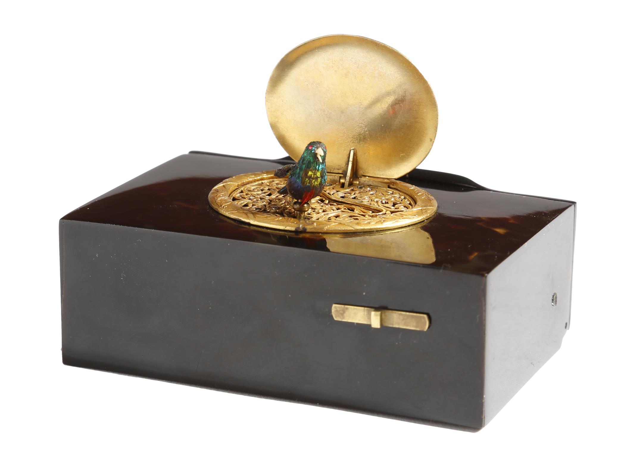 λ A late 19th century Swiss tortoiseshell singing bird box, the top with a gilt brass hinged lid engraved with birds and flowers revealing a pierced grille and a brightly coloured bird, activated by a lever on the front of the box, the back with a hinged compartment, 10cm wide.