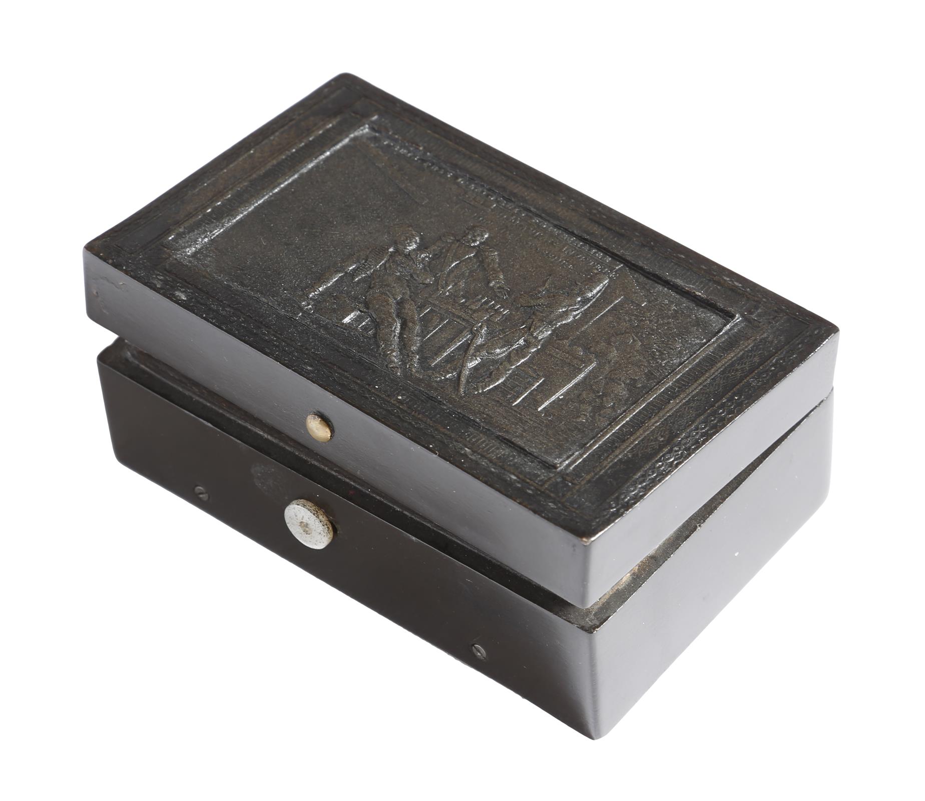 A mid-19th century Swiss pressed horn musical box, the hinged lid with a tavern scene with soldiers and indistinctly inscribed, the three inch cylinder playing three airs, 10.7cm wide.
