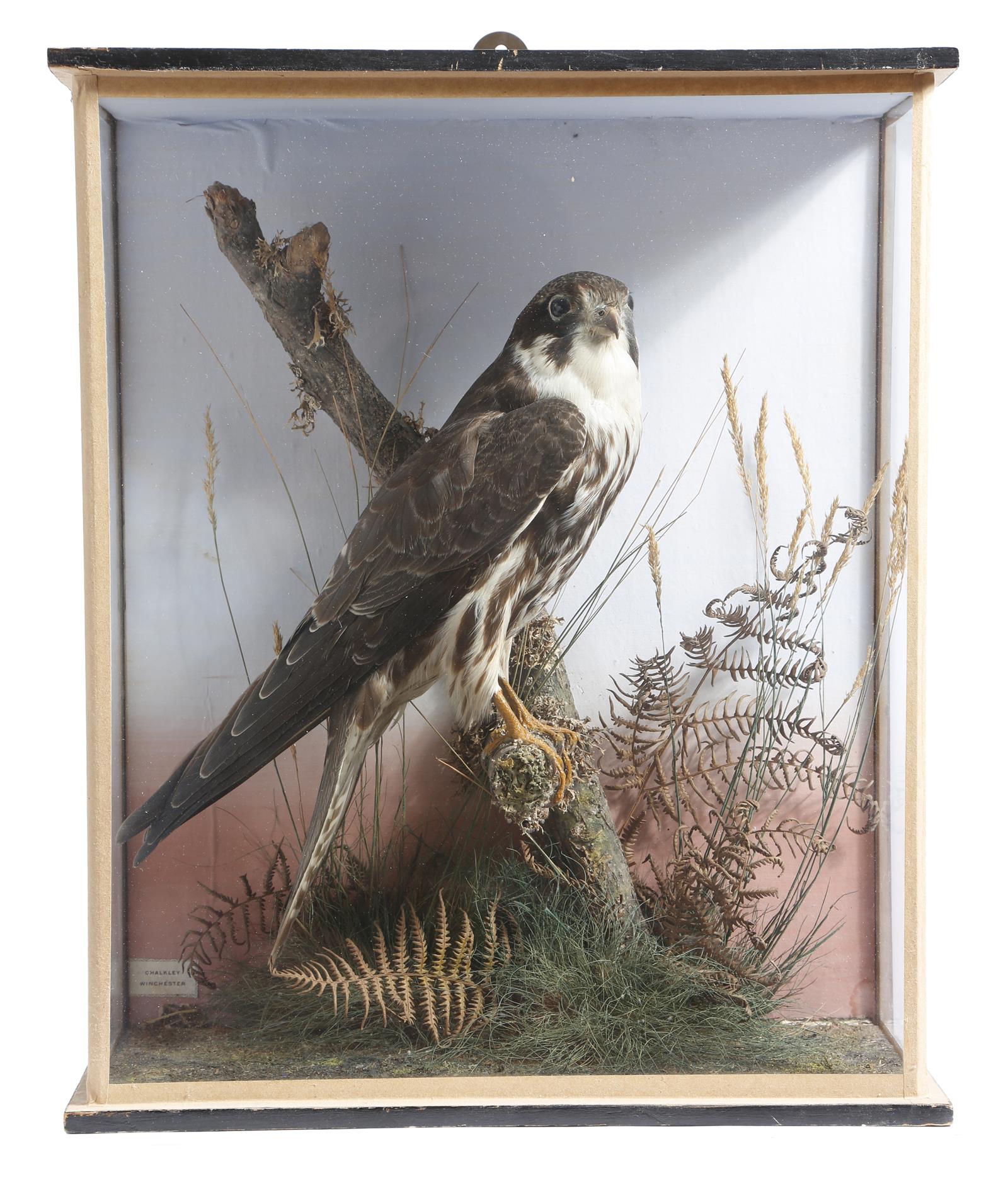 AMENDED Taxidermy. A preserved hobby falcon by William Chalkley, mounted in a naturalistic setting, with a printed paper label 'CHALKLEY WINCHESTER', in a glazed case part ebonised case, with trade label to verso inscribed 'W. CHALKLEY, Taxidermist, & c., THE SQUARE, WINCHESTER', early 20th century, 37.8cm high, 31.5cm wide, 14.3cm deep.