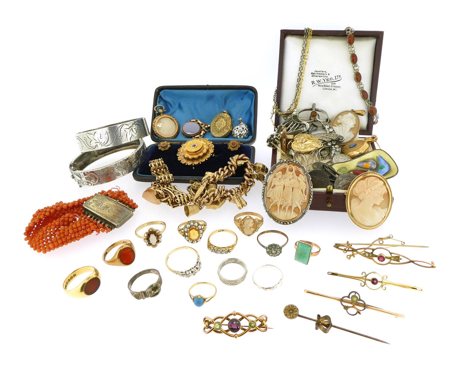 Various items of jewellery, including a 9ct gold graduated curb-link bracelet with 9ct gold padlock clasp and mounted with assorted gold charms, 37g, a 9ct gold fancy gate-link bracelet with 9ct padlock clasp, 15g, ten assorted gem-set gold rings, a late Victorian gold circular brooch set with a ruby and rose-cut diamonds with matching earrings and fitted case, four assorted gem-set gold brooches, a silver Charles Horner brooch set with a citrine, a steel wristwatch by Rotary and various items of silver jewellery