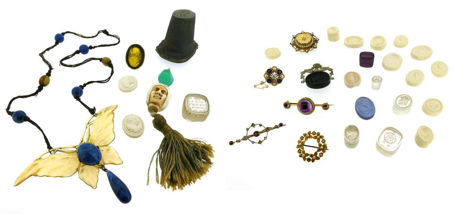 A collection of glass intaglios, probably by James Tassie (1735-1799), a metal casting block depicting the head of a Assyrian revival man and with resin cast, with seventeen further opaque white glass casts of five classical figures and King George III, a glass model of a man's head wearing a turban with green-stone pendant and tassle, a gold brooch centred with a diamond with four amethysts and four seed pearls, a garnet and seed pearl-set gold bar brooch, a circular gold brooch centred with a diamond within a surround of seed pearls and further border of larger pearls, a gold flower head brooch set with seed pearls and a gold brooch set with three circular cabochon amethysts, an Art Nouveau pressed horn butterfly pendant mounted with two blue glass beads and further glass beads to the necklace, 10cm wide, a yellow glass intaglio-mounted silver ring depicting Brutus with the words 'Eid Mar', a clear glass intaglio engraved with the mizpah inscription under the all-seeing eye and reference to Genesis XXXI 49, with a soft-back pamphlet for James Tassie, Scottish Masters from The National Galleries of Scotland