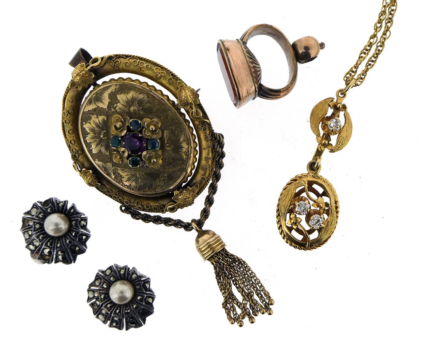 A diamond-set gold pendant, on a twisted-link gold chain, a Victorian gold pendant set with emeralds and a garnet in yellow gold, a gold fob seal set with a carnelian and a pair of silver marcasite earrings