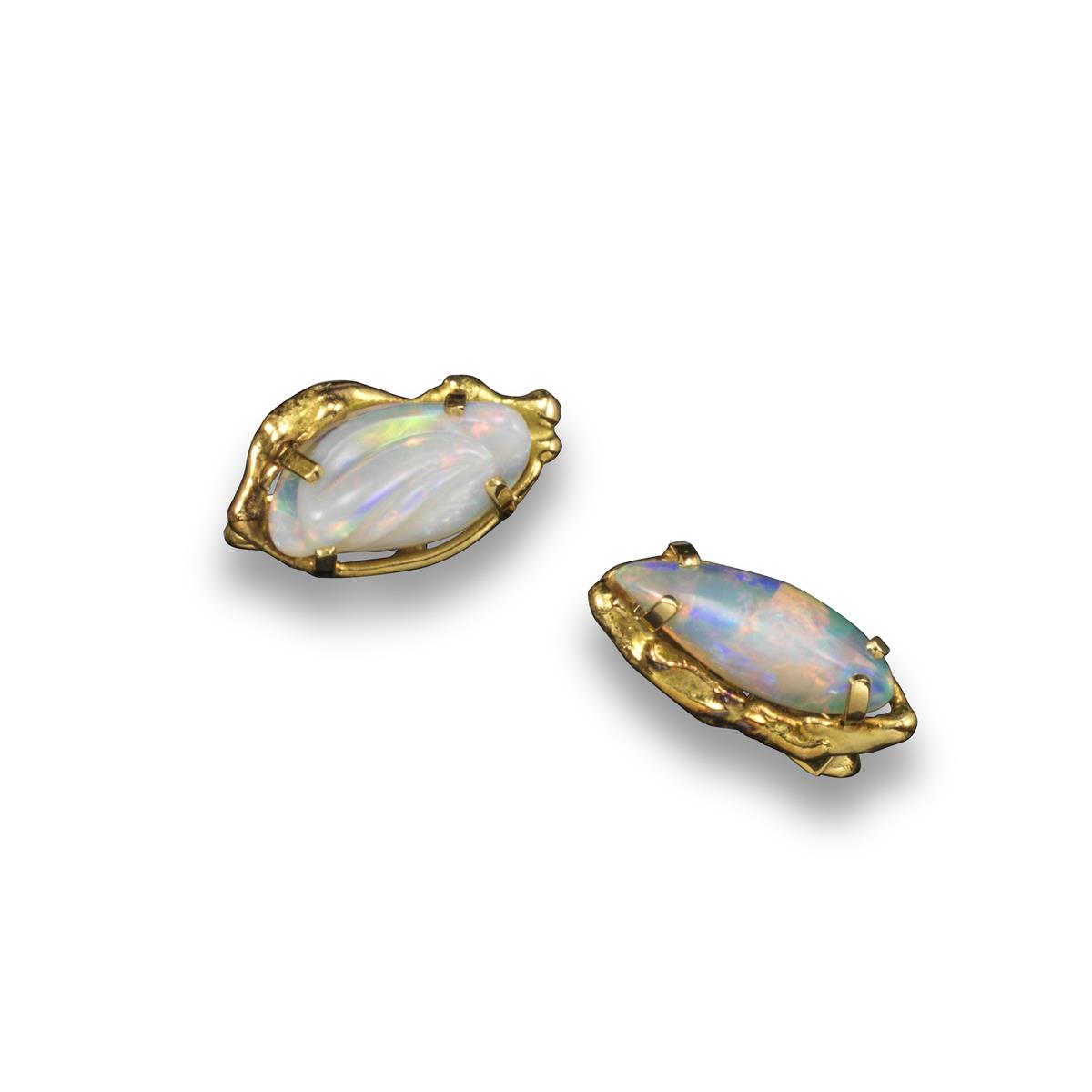 A pair of carved abstract opal cufflinks, set in textured yellow gold, maker's mark JMW and London hallmarks for 1997, each link 2.2cm wide