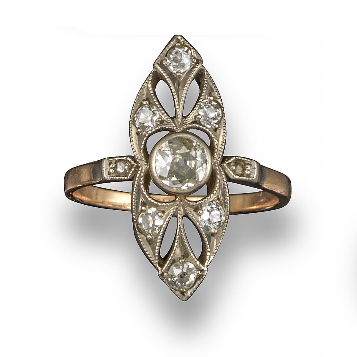An early 20th century navette-shaped diamond cluster ring, set with an old cushion-shaped diamond within pierced millegrain-set diamond surround in platinum and gold, size Q