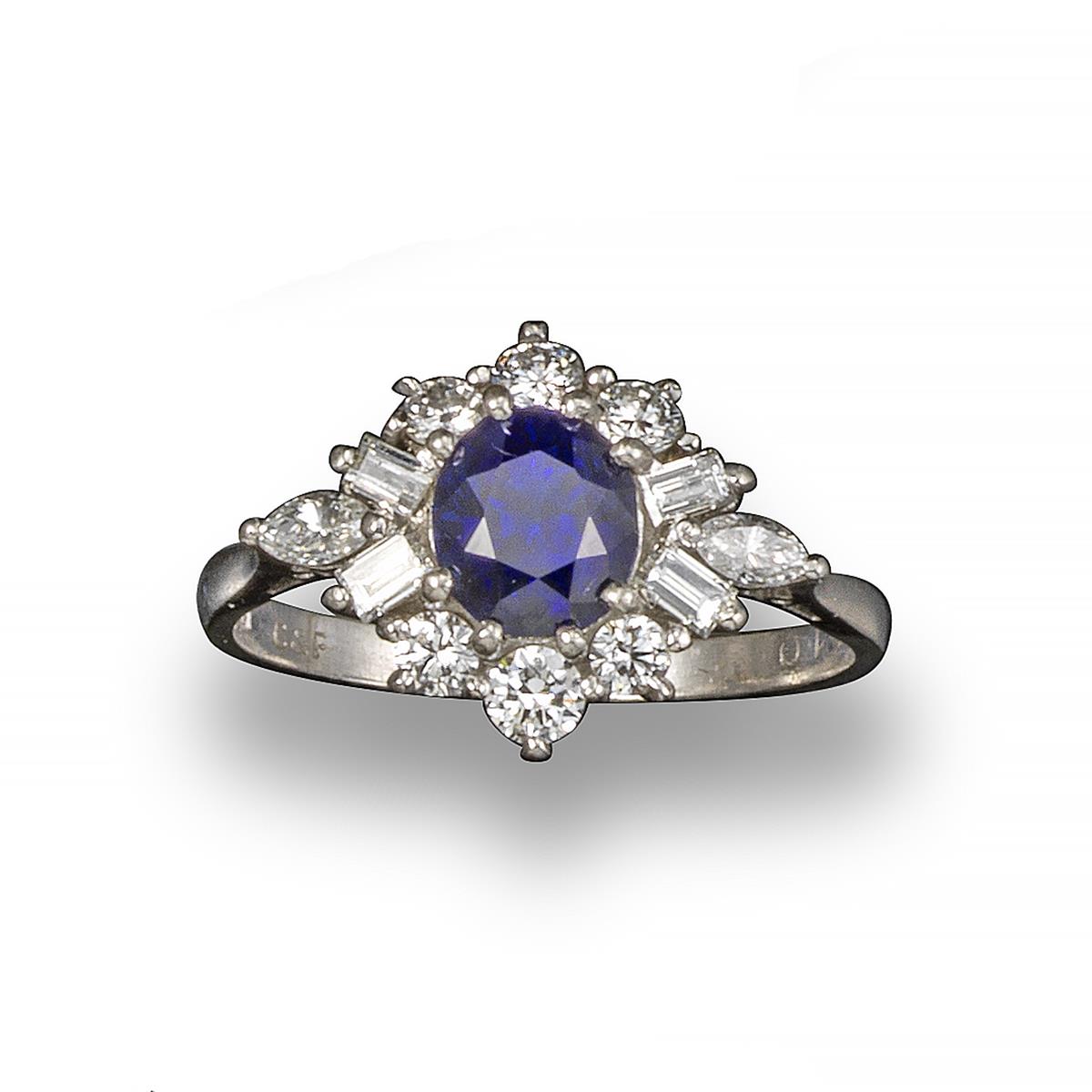 A sapphire and diamond cluster ring, the slightly oval-shaped sapphire set within a surround of round brilliant, baguette and marquise-shaped diamonds in white gold, size O