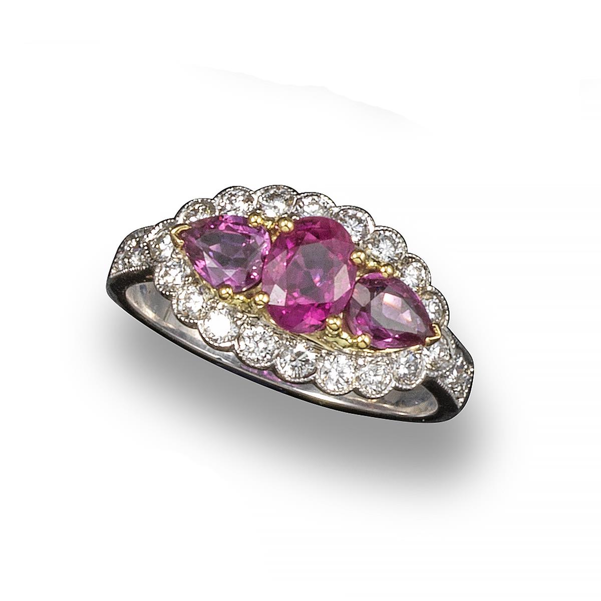 A ruby and diamond cluster ring, the oval-shaped ruby weighs approximately 0.80cts, set with two pear-shaped rubies, within a surround of round brilliant-cut diamonds and two further round brilliant-cut diamonds to each shoulder, size M