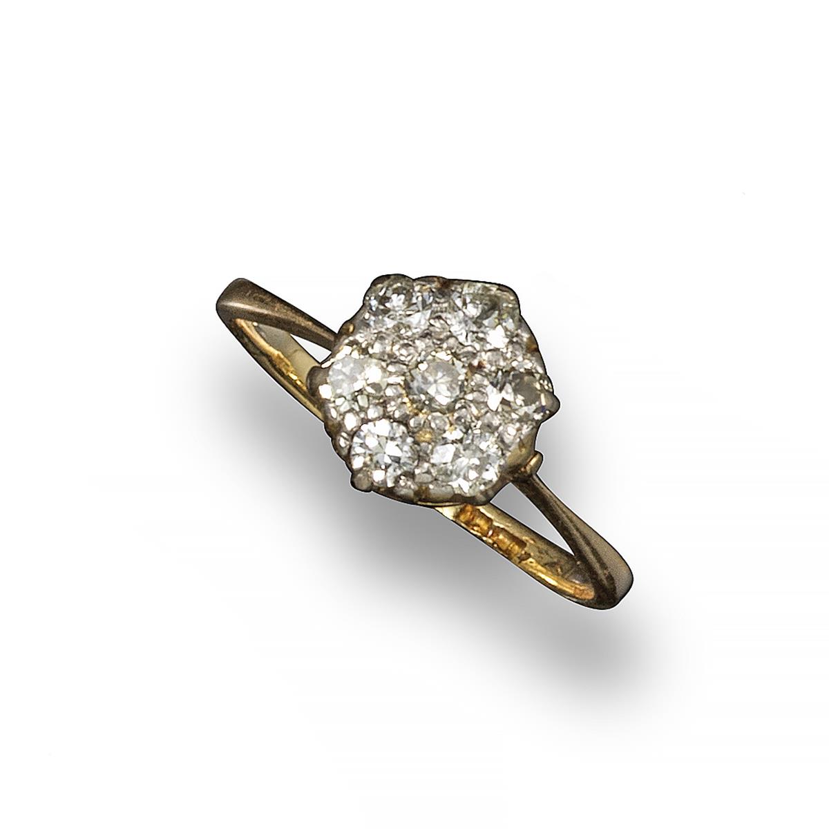 A diamond cluster ring, the seven circular-cut diamonds are set in gold, size M