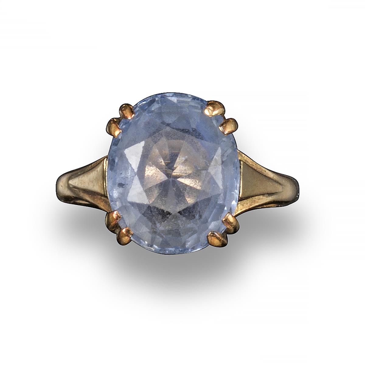 A sapphire solitaire ring, the oval-shaped sapphire set in yellow gold, size M